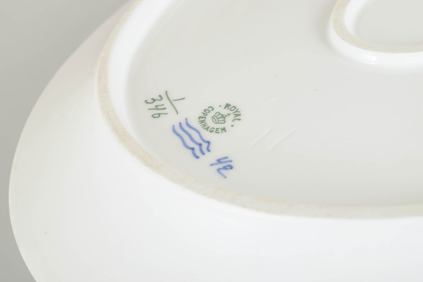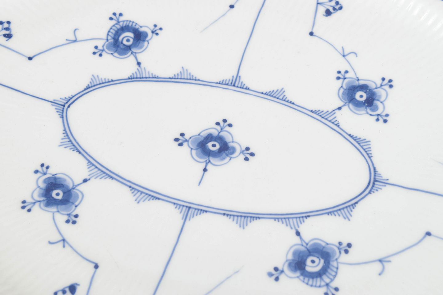 Musselmalet riflet blev introduceret i 1775 og er Royal Copenhagens ældste og mest ikoniske stel. Det stringente, riflede formsprog kombineret med den håndmalede blå dekoration, inspireret af kinesisk blå-hvid porcelæn, har gjort stellet tidløst og anvendeligt gennem generationer. Serveringsfade som dette var centrale elementer i det dækkede bord og er i dag populære både til brug og samling.