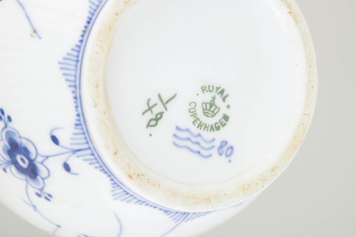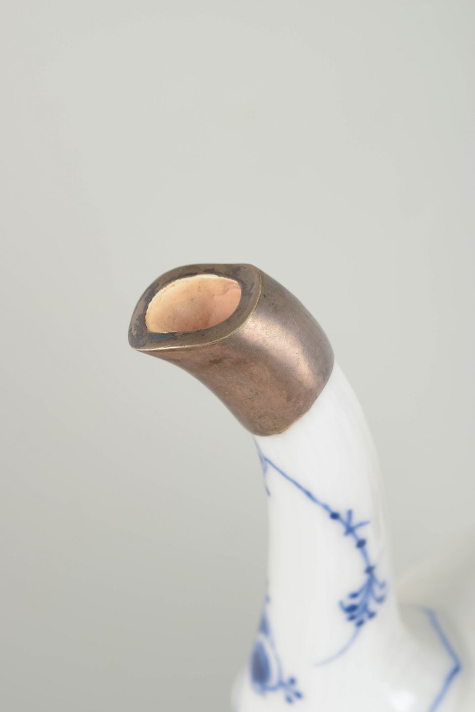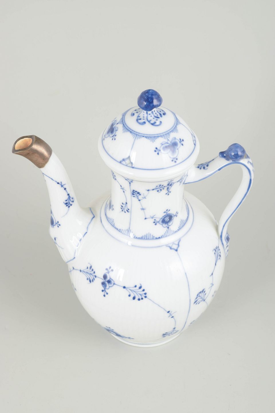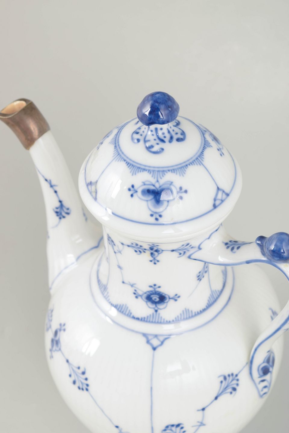 Musselmalet riflet blev introduceret i 1775 og er Royal Copenhagens ældste stel samt et ikon inden for dansk porcelæn. I første halvdel af 1900-tallet var det almindeligt at lade beskadigede tudspidser montere med sølv, hvilket både var en praktisk løsning og i tråd med tidens respekt for håndværk og materialer. Sådanne indgreb vidner i dag om genstandens brugshistorie og værdsættes af samlere.