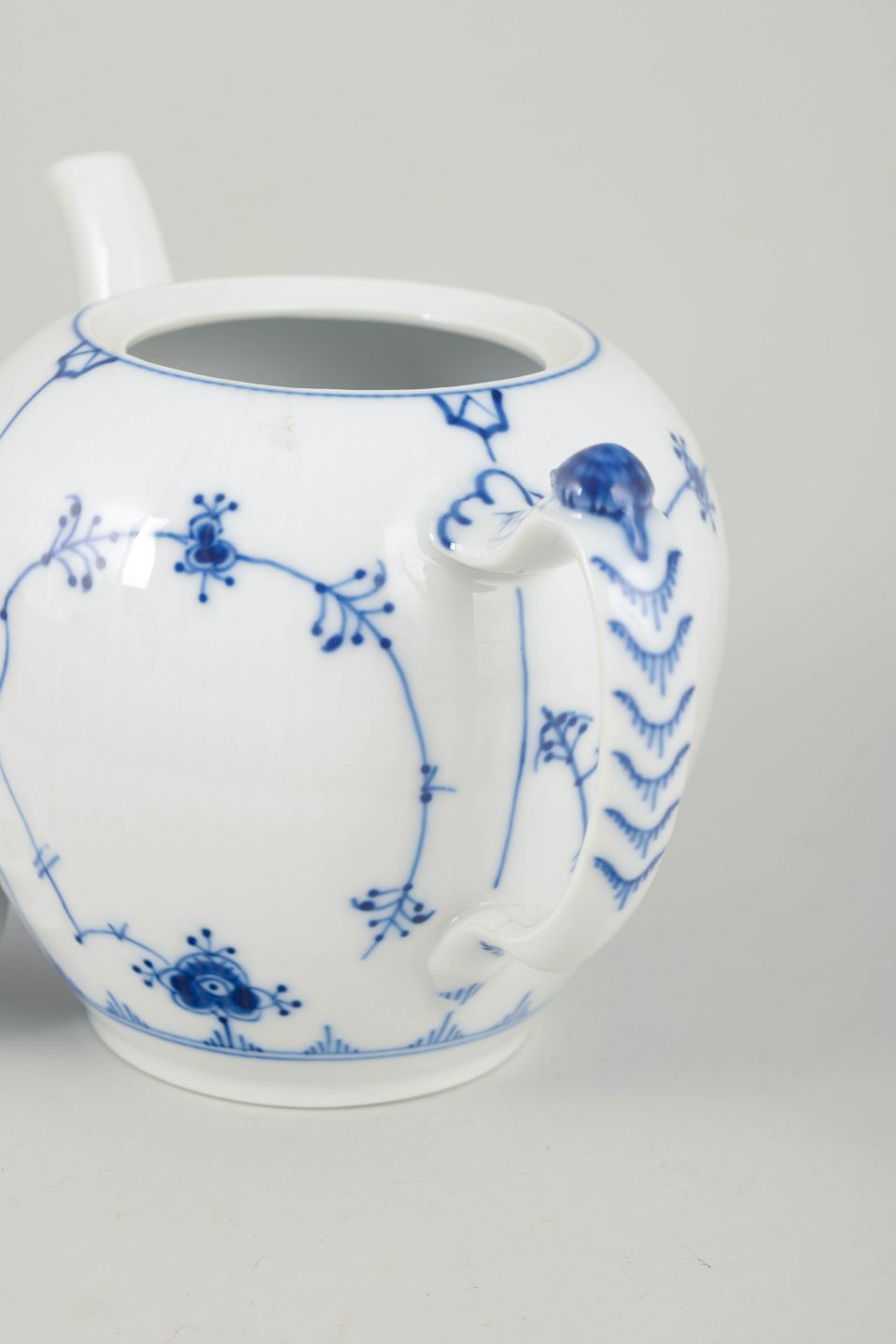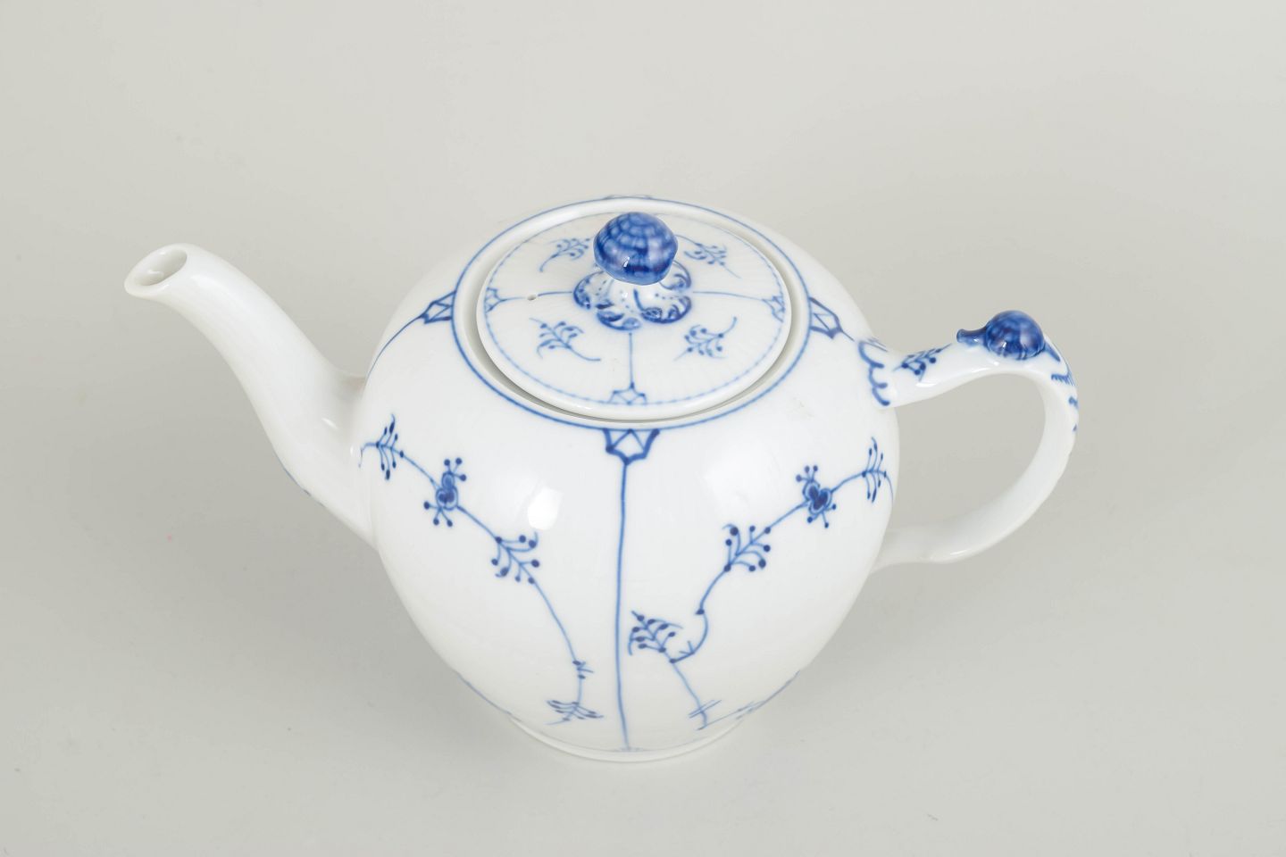 Klassisk tekande i Musselmalet, riflet, udført i den traditionelle riflede form uden blondekant og dekoreret med håndmalet koboltblå underglasur. Den harmoniske og velafbalancerede form med elegant tud samt låg med knop gør kanden velegnet til både daglig brug og samling.