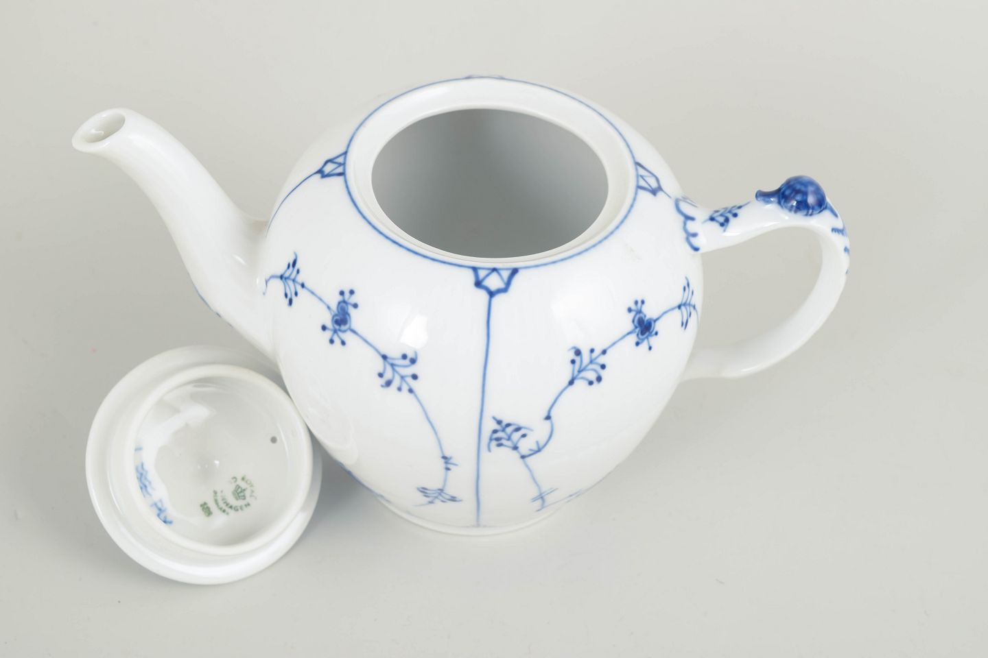 Musselmalet Riflet blev introduceret i 1775 og er Royal Copenhagens ældste og mest traditionsrige stel. Dekorationen er inspireret af kinesisk blå-hvid porcelæn og kendetegnes af sin stringente komposition, de riflede former og de fine håndmalede detaljer. Tekander i dette stel har været produceret gennem generationer og repræsenterer et tidløst eksempel på dansk porcelænshåndværk.