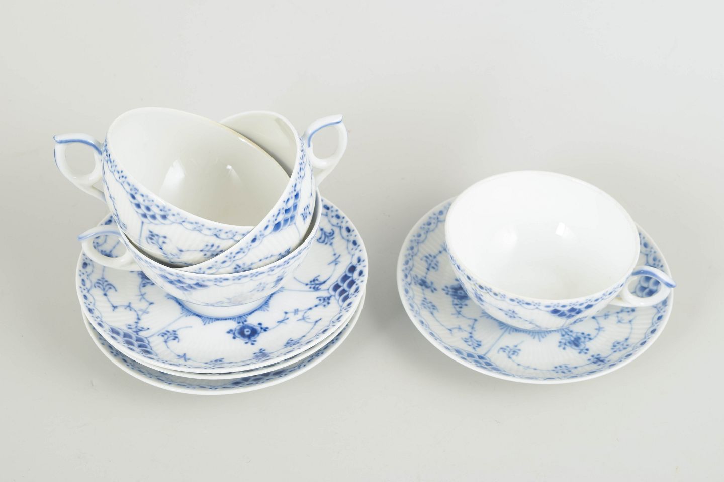 Sæt bestående af 4 tekopper med tilhørende underkopper i Musselmalet halvblonde. Klassiske riflede former med blondekant og håndmalet koboltblå dekoration.
