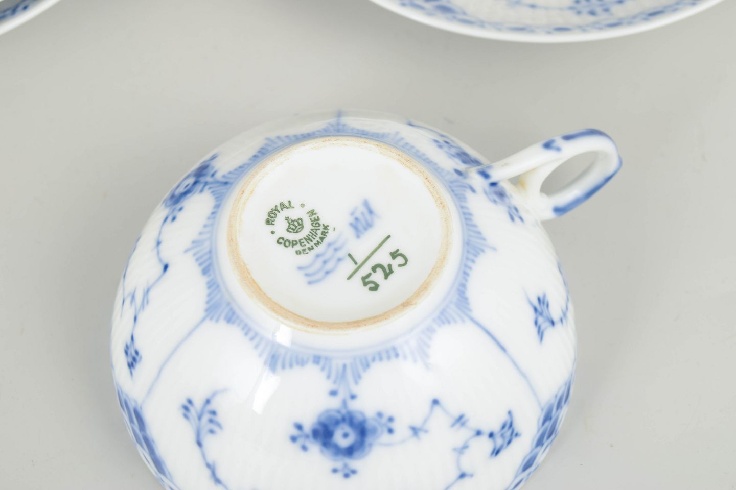 Musselmalet halvblonde blev introduceret i 1885 som en mere dekorativ variant af det klassiske musselmalede stel. Tekopper med underkopper har gennem generationer været en fast del af Royal Copenhagens teservicer.