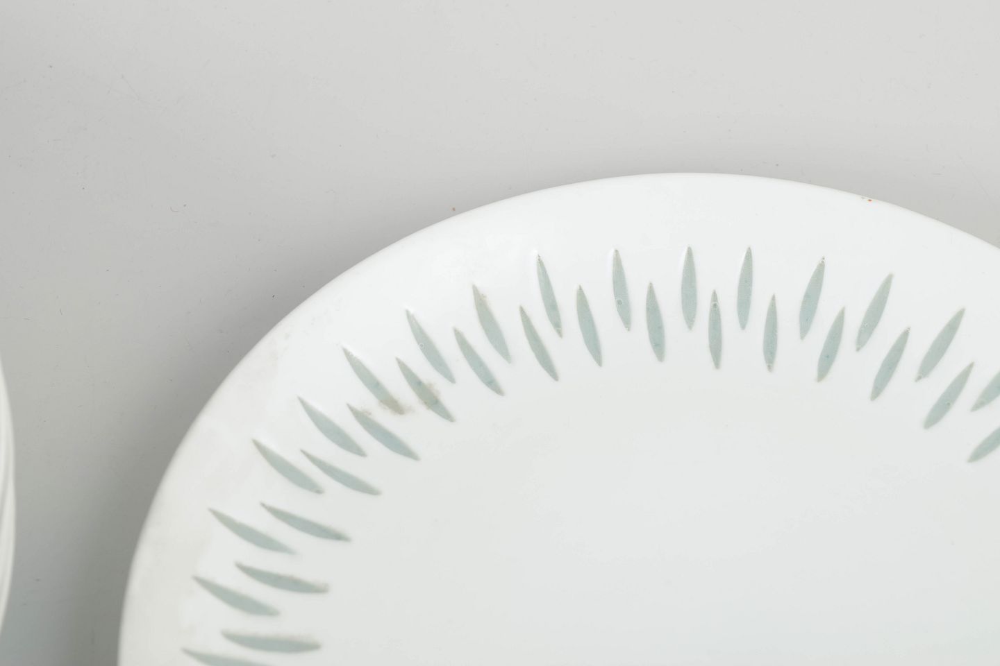 Sæt bestående af seks tallerkener i hvidt porcelæn dekoreret med karakteristisk “rice porcelain”-ornamentik langs fanen. De aflange, transparente glasurfelter danner en let og rytmisk bort, som giver tallerkenerne et elegant og luftigt udtryk. Det enkle formsprog er typisk for Friedl Holzer-Kjellbergs sene porcelænsdesign for Arabia.