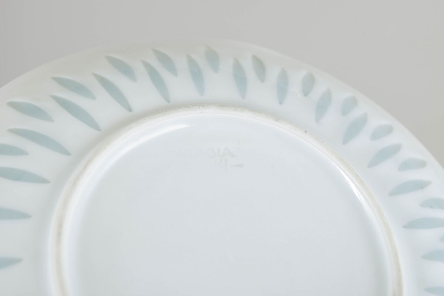 Sæt bestående af fire tekopper med tilhørende underkopper i hvidt porcelæn med gennembrudt “rice porcelain”-dekoration. De aflange perforeringer udfyldt med transparent glasur giver porcelænet et let og næsten translucent udtryk, mens de enkle, afrundede former er karakteristiske for Friedl Holzer-Kjellbergs sene modernistiske porcelænsdesign for Arabia.