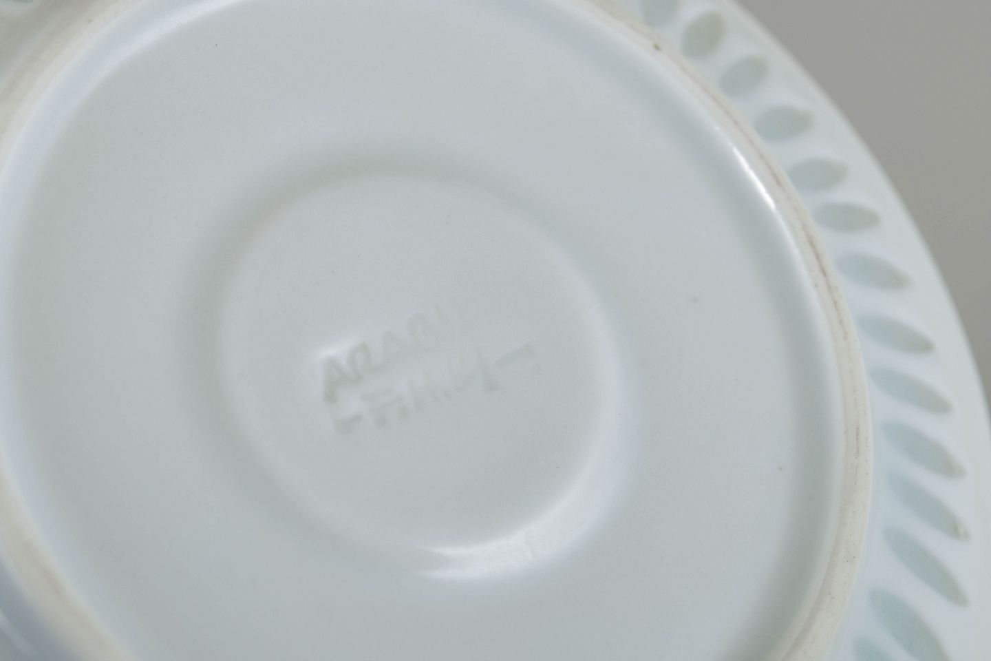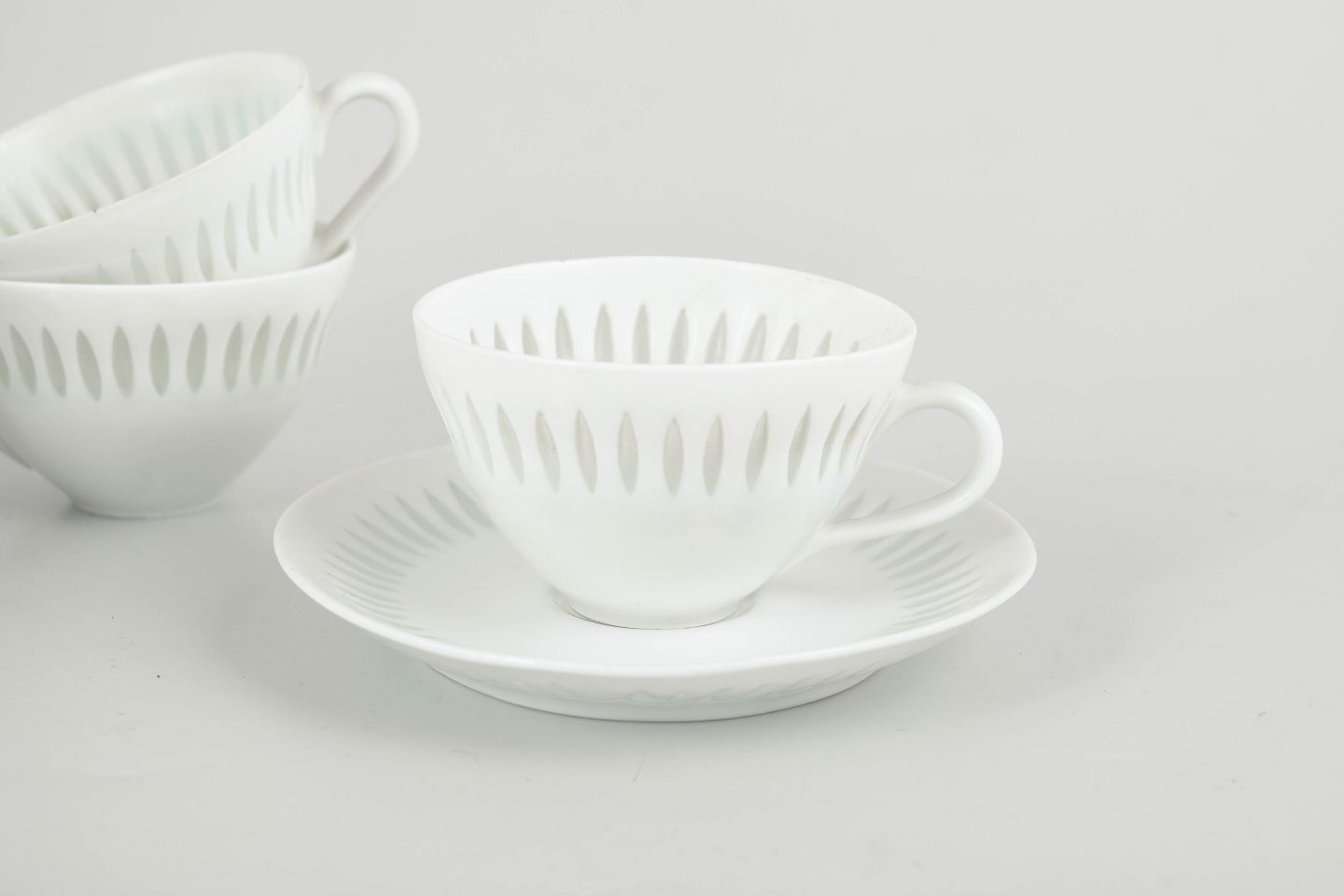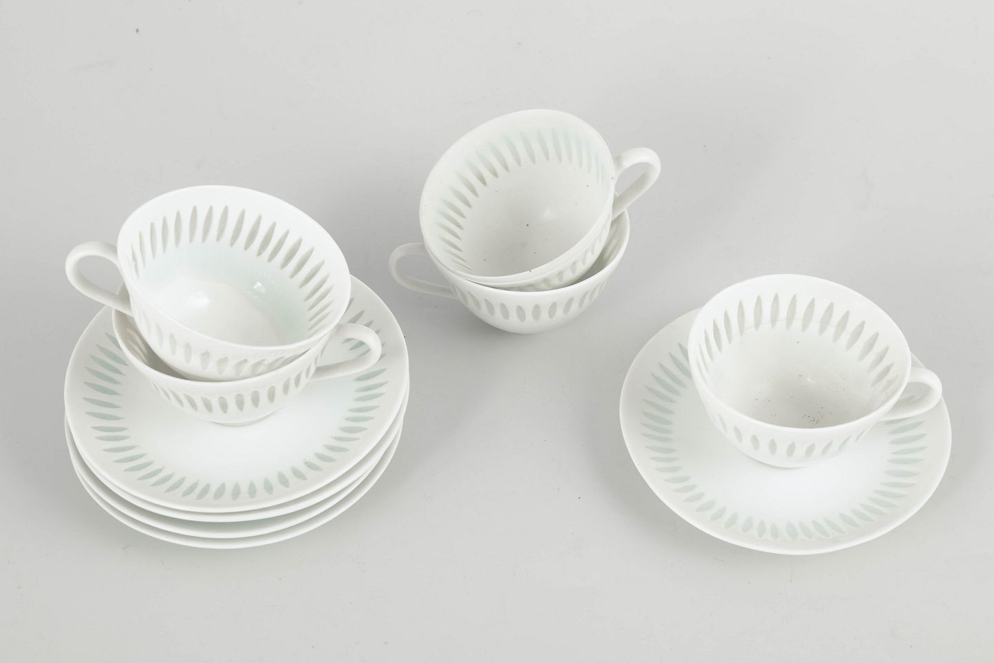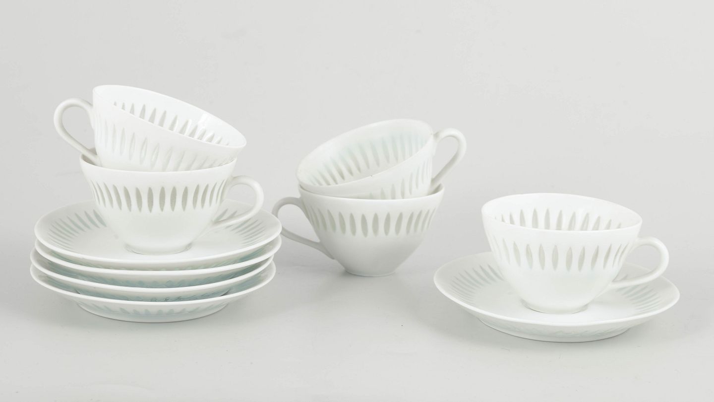 Større sæt bestående af fem mokkakopper med underkopper i hvidt porcelæn med gennembrudt “rice porcelain”-dekoration. De fine, aflange perforeringer udfyldt med transparent glasur giver porcelænet et let, næsten translucent udtryk. De enkle, harmoniske former er karakteristiske for Friedl Holzer-Kjellbergs sene modernistiske design for Arabia.