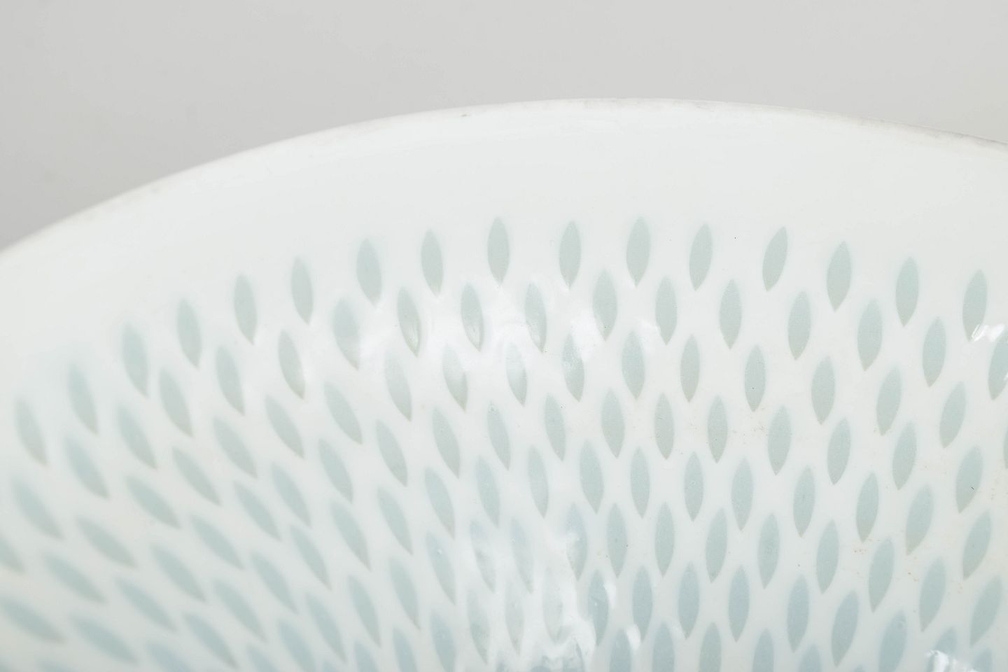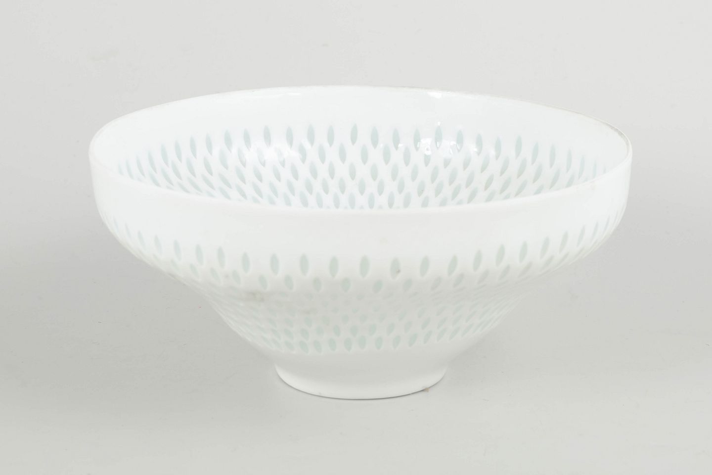 Stor, elegant skål i hvidt porcelæn med gennembrudt “rice porcelain”-struktur, hvor det fine, perforerede mønster skaber et let og transparent udtryk. Den balancerede, koniske form og den subtile dekoration er karakteristisk for Friedl Holzer-Kjellbergs modernistiske designs for Arabia.