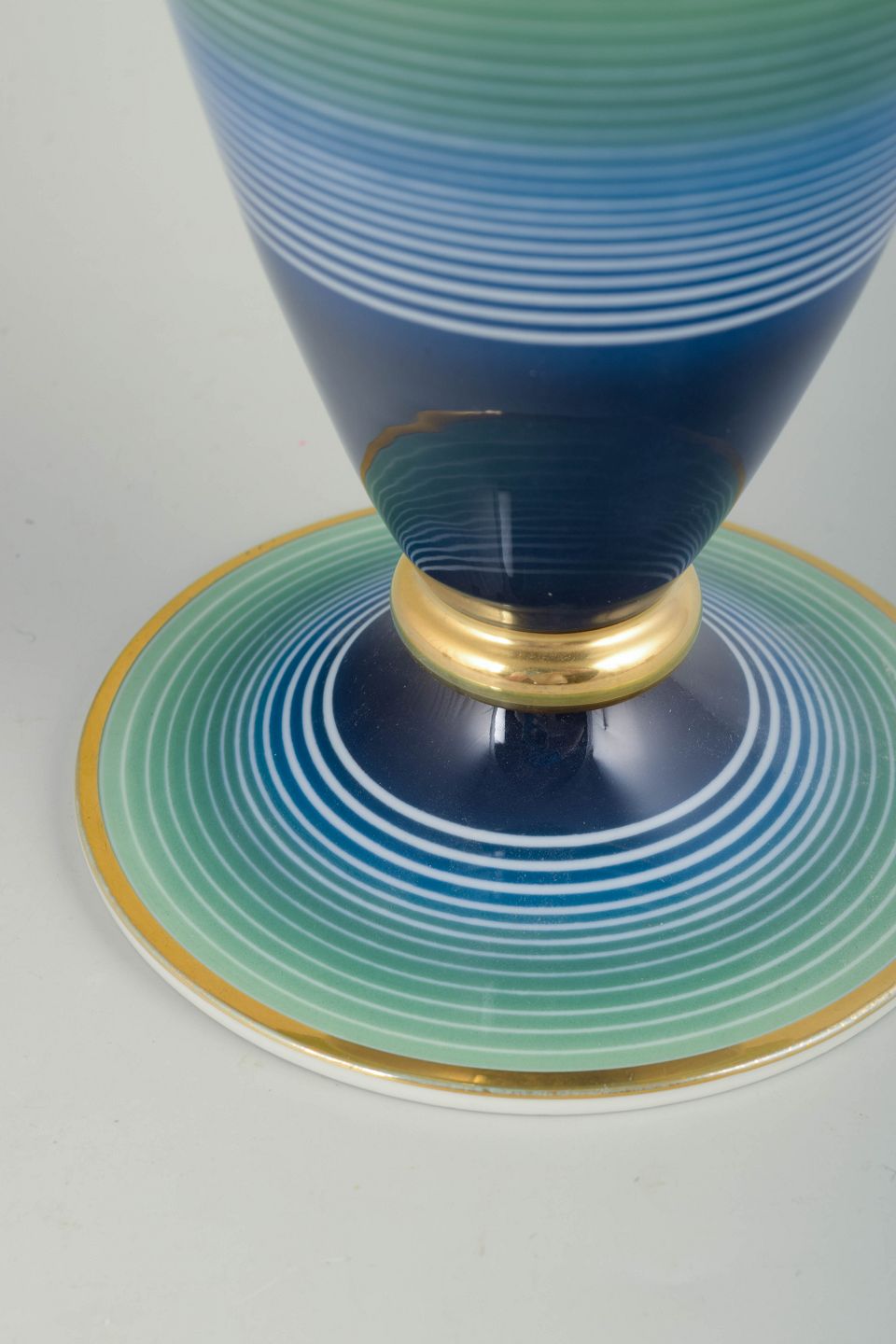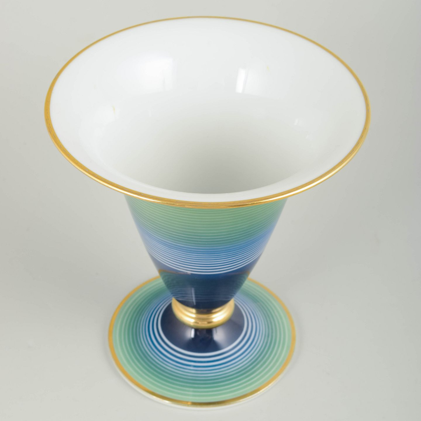 Elegant Art Deco-vase i porcelæn med konisk form, dekoreret med fine horisontale linjer i graduerede blå og grønne nuancer. Formen og farveforløbet er typisk for Rosenthals Art Deco-produktion, hvor stram geometri kombineres med raffineret glasurarbejde og diskrete gulddetaljer.