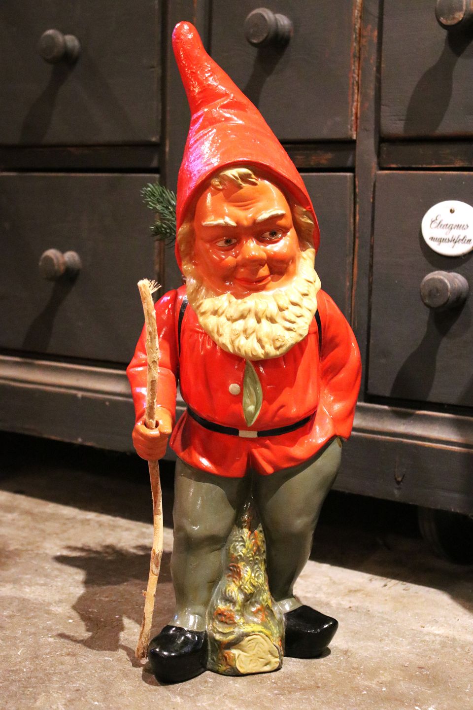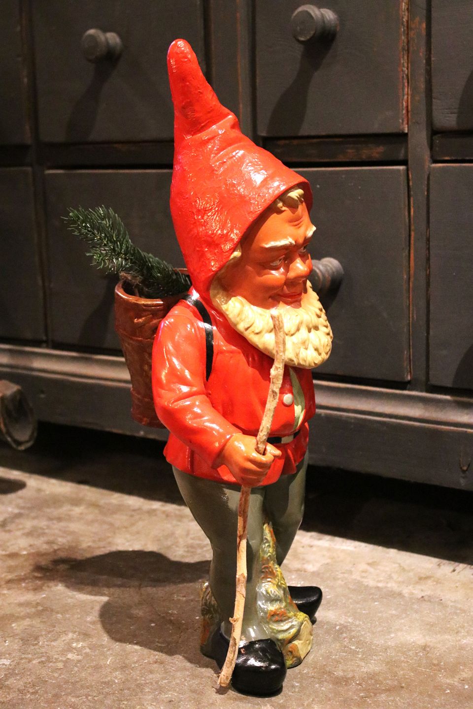 Stor terrakotta nisse fra 50érne med fin bemaling , rygsæk og stok i træ.