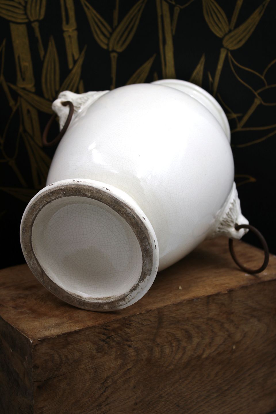 Gammel glaseret stentøjs lågkrukke med løvehoveder på siden.