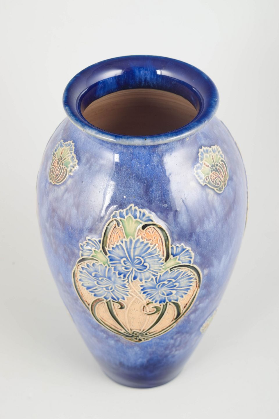Elegant Art Nouveau-vase udført i glaseret stentøj med dyb blå løbende glasur og reliefdekorerede blomsterfelter i lyse og varme nuancer. Vasen har en harmonisk balusterform med let udadbøjet munding og fremstår som et klassisk eksempel på Royal Doultons dekorative produktion i mellemkrigstiden.