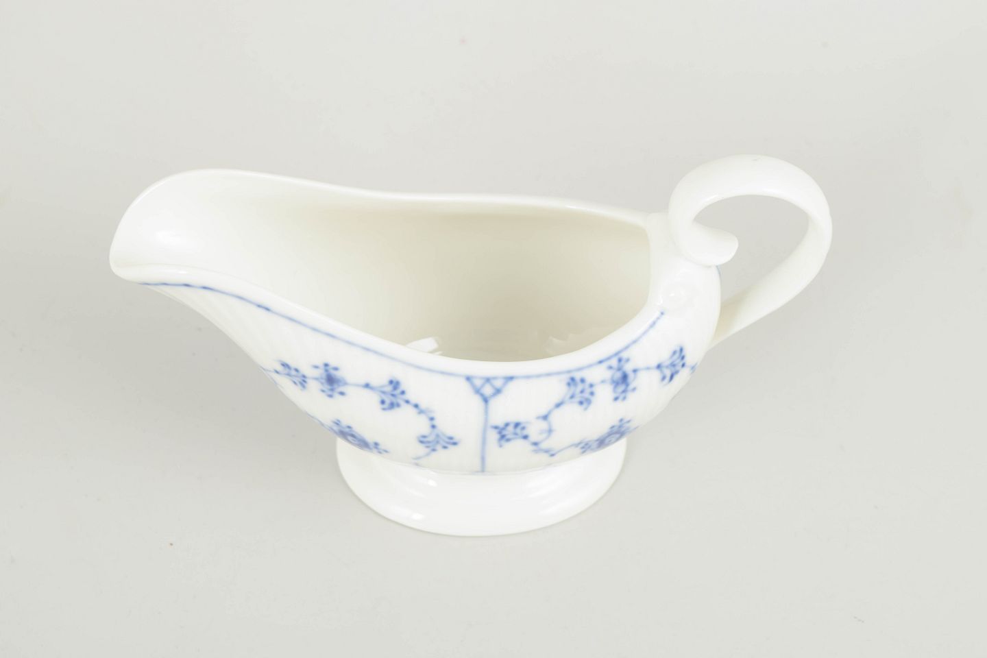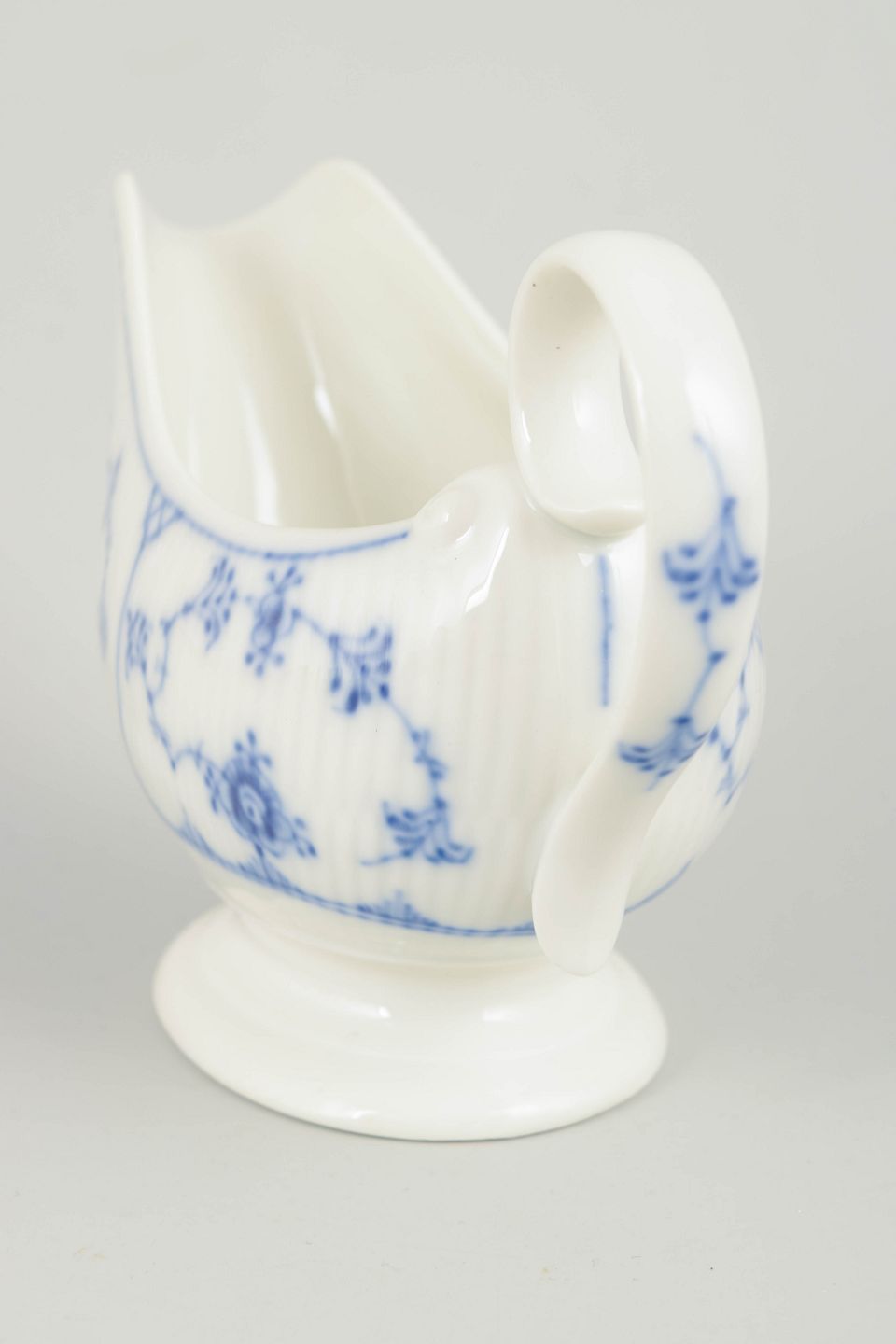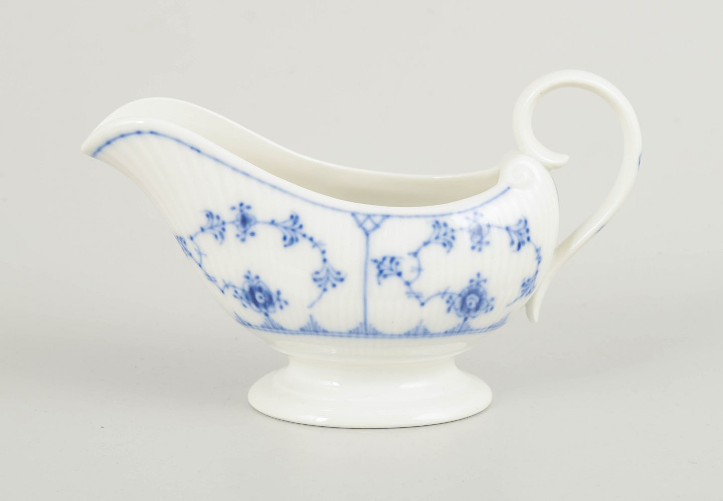 Klassisk saucekande i Musselmalet Riflet, udført i riflet form med svungen tud, hank og fodring. Dekoreret med håndmalet koboltblå underglasur i det traditionelle musselmalede mønster. En funktionel og elegant serveringsdel, velegnet til smørsauce og andre varme saucer ved det dækkede bord.