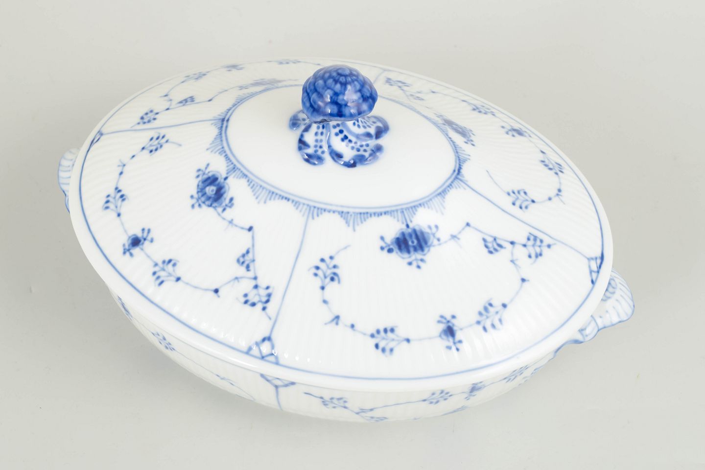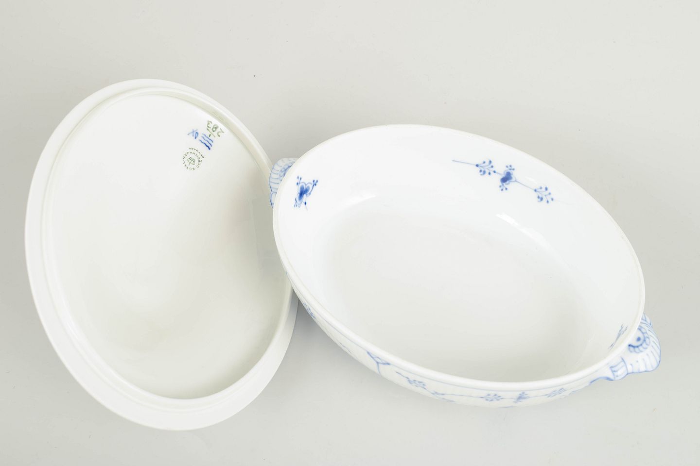 Text zugänglich auf Dänische: Royal Copenhagen Musselmalet Riflet oval terrin med låg, 1962.
