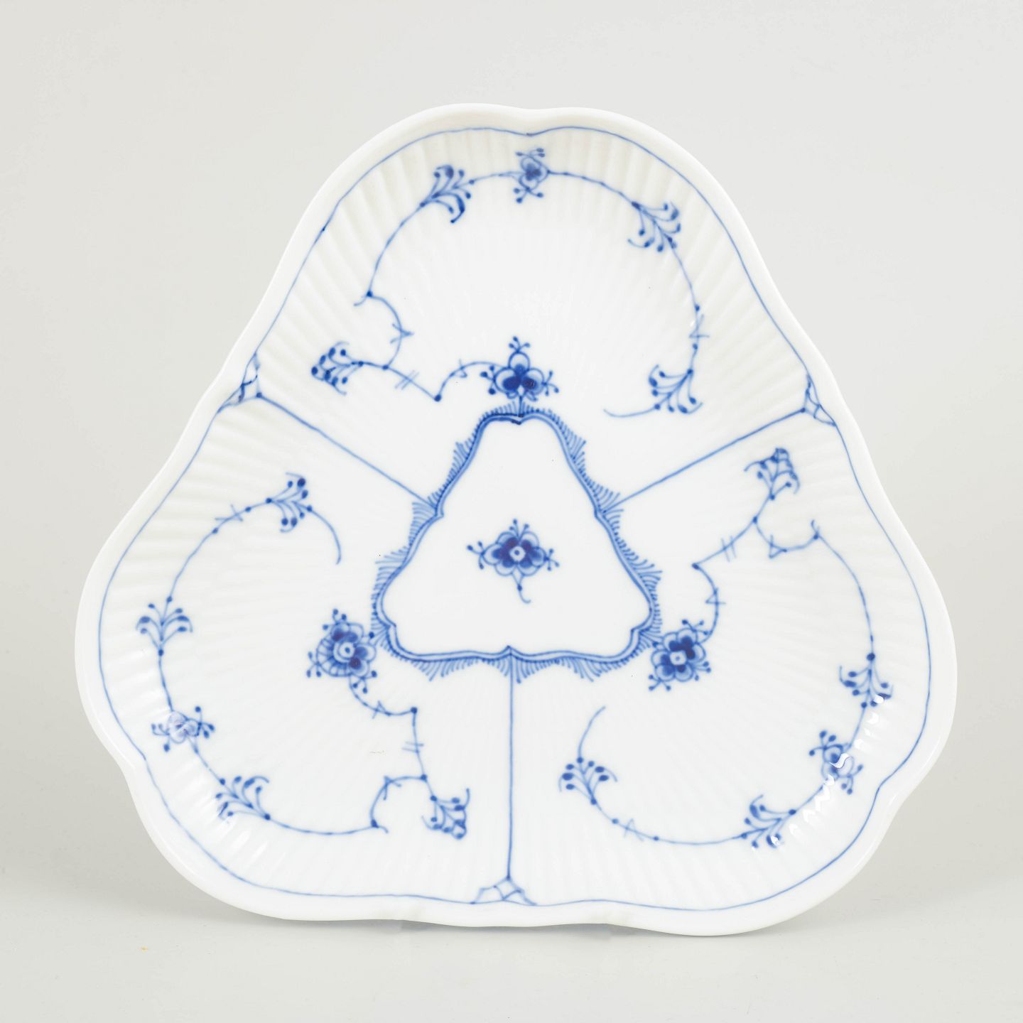 Karakteristisk trekantet fad i Musselmalet Riflet, udført i klassisk riflet form og dekoreret med håndmalet koboltblå underglasur. Fadet er opdelt i tre felter med centralt trekantet spejl og fremstår som en markant og relativt sjældent forekommende serveringsmodel i stellet.