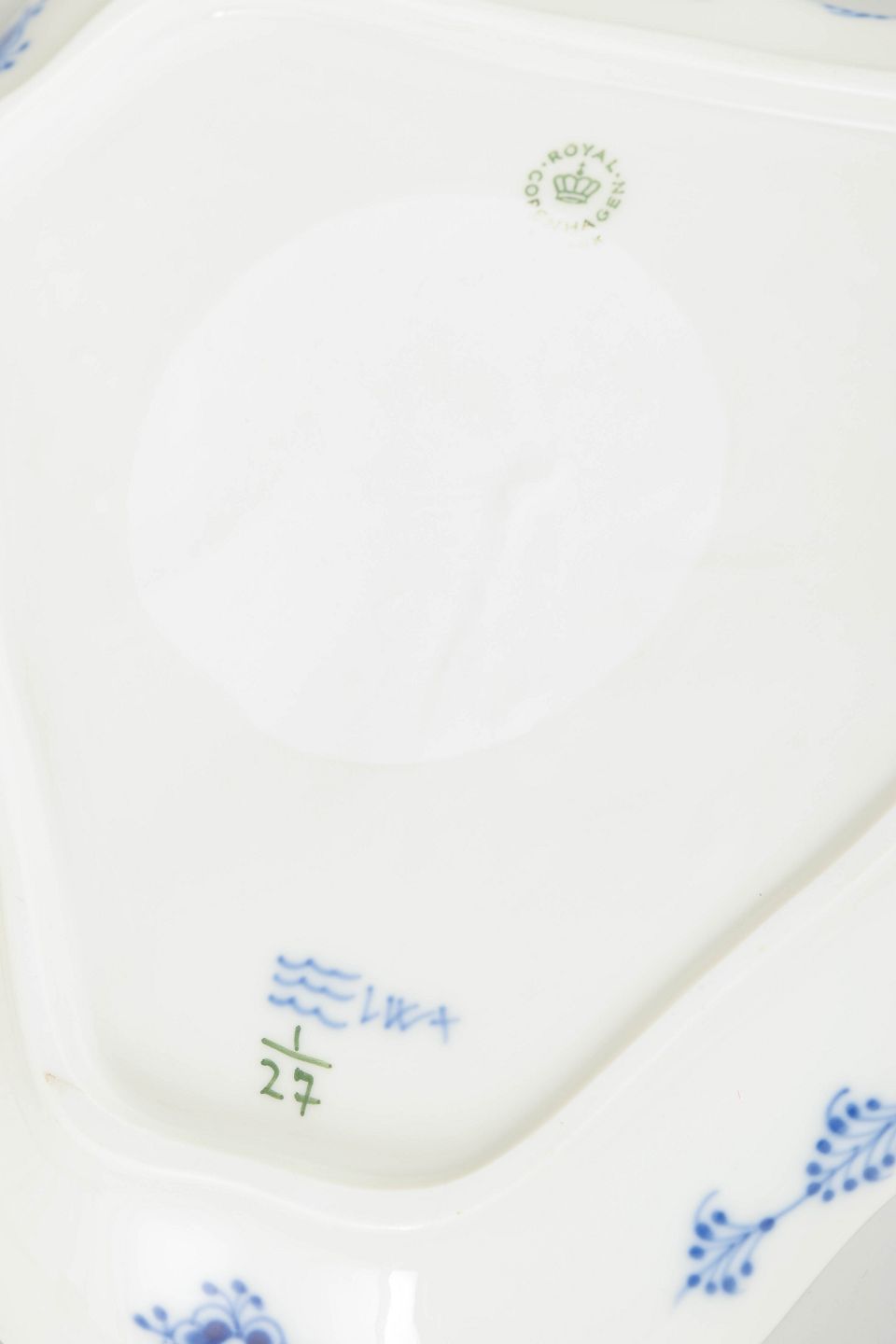 Musselmalet Riflet blev introduceret i 1775 og er Royal Copenhagens ældste og mest traditionsrige stel. Dekorationen er inspireret af kinesisk blå-hvid porcelæn og kendetegnes af sin stringente opbygning, rytmiske penselføring og fine håndmalede detaljer. Mere formmæssigt markante serveringsdele som dette trekantede fad blev produceret i mindre oplag og afspejler fabrikkens fortsatte udvikling af klassiske stel i midten af det 20. århundrede.