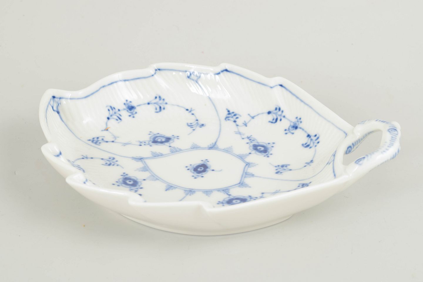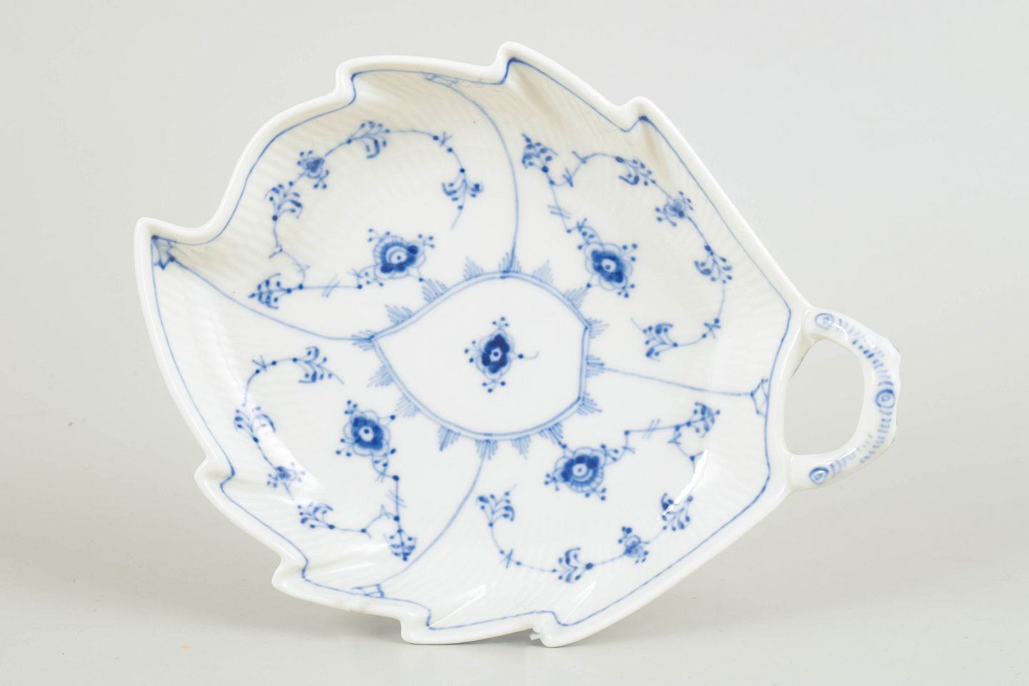 Dekorativt fad i Musselmalet Riflet, udført i bladformet model med integreret hank og let bølget rand. Fadet er dekoreret med håndmalet koboltblå underglasur i det klassiske musselmalede mønster og kombinerer en skulpturel form med praktisk anvendelse. En karakterfuld og relativt sjælden serveringsdel i stellet.