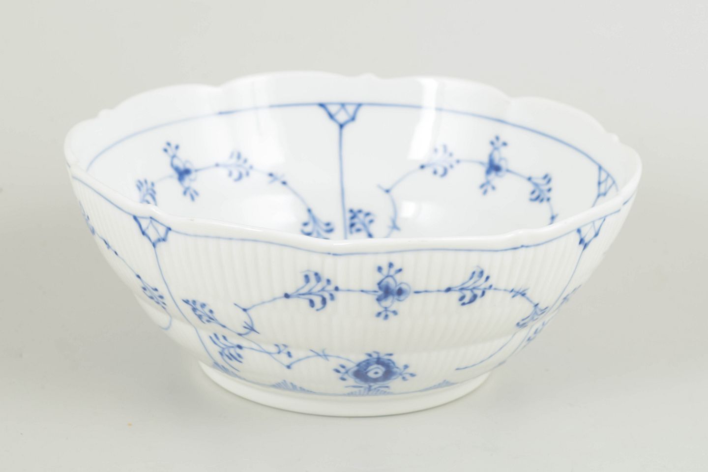 Sjælden skål i Musselmalet Riflet, udført i klassisk riflet form og dekoreret med håndmalet koboltblå underglasur. Skålen har en let bølget rand og fremstår som en mindre almindelig model inden for stellet, velegnet både til servering og som dekorativ del på bordet.