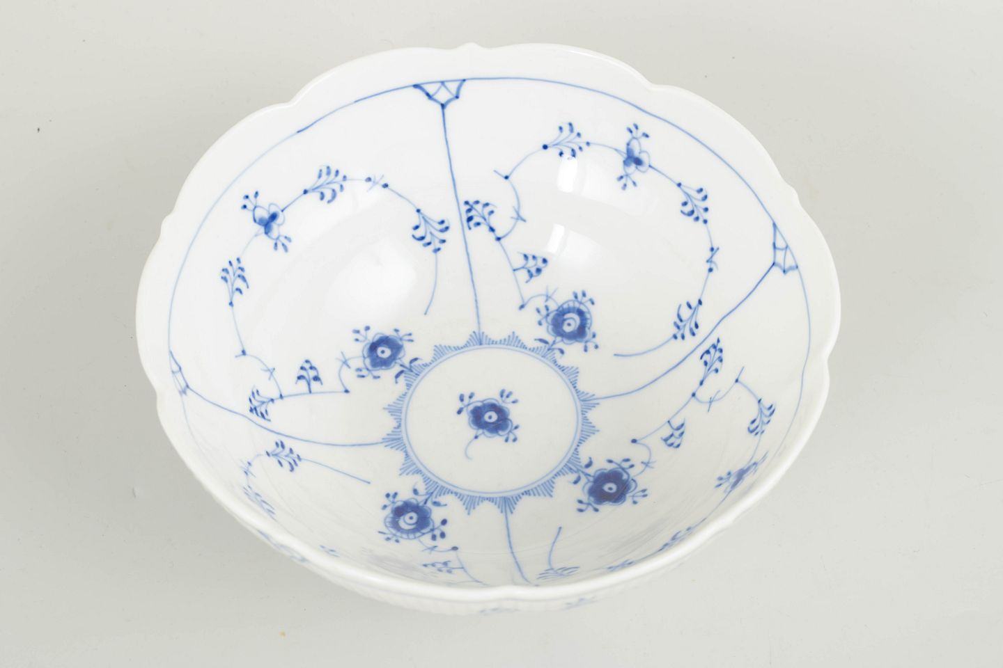 Text zugänglich auf Dänische: Royal Copenhagen Musselmalet Riflet skål, 1963.
