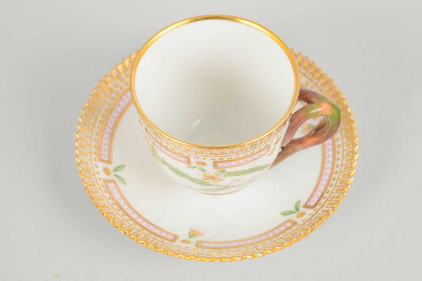 Bio: Flora Danica-stellet blev introduceret i 1790 og regnes blandt Royal Copenhagens mest prestigefyldte produktioner. Dekorationerne er baseret på det monumentale botaniske værk Flora Danica og er kendetegnet ved høj detaljerigdom og fremragende håndværksmæssig kvalitet. Demitassekopper var traditionelt anvendt til servering af stærk kaffe og repræsenterer en raffineret del af det klassiske kaffestel.