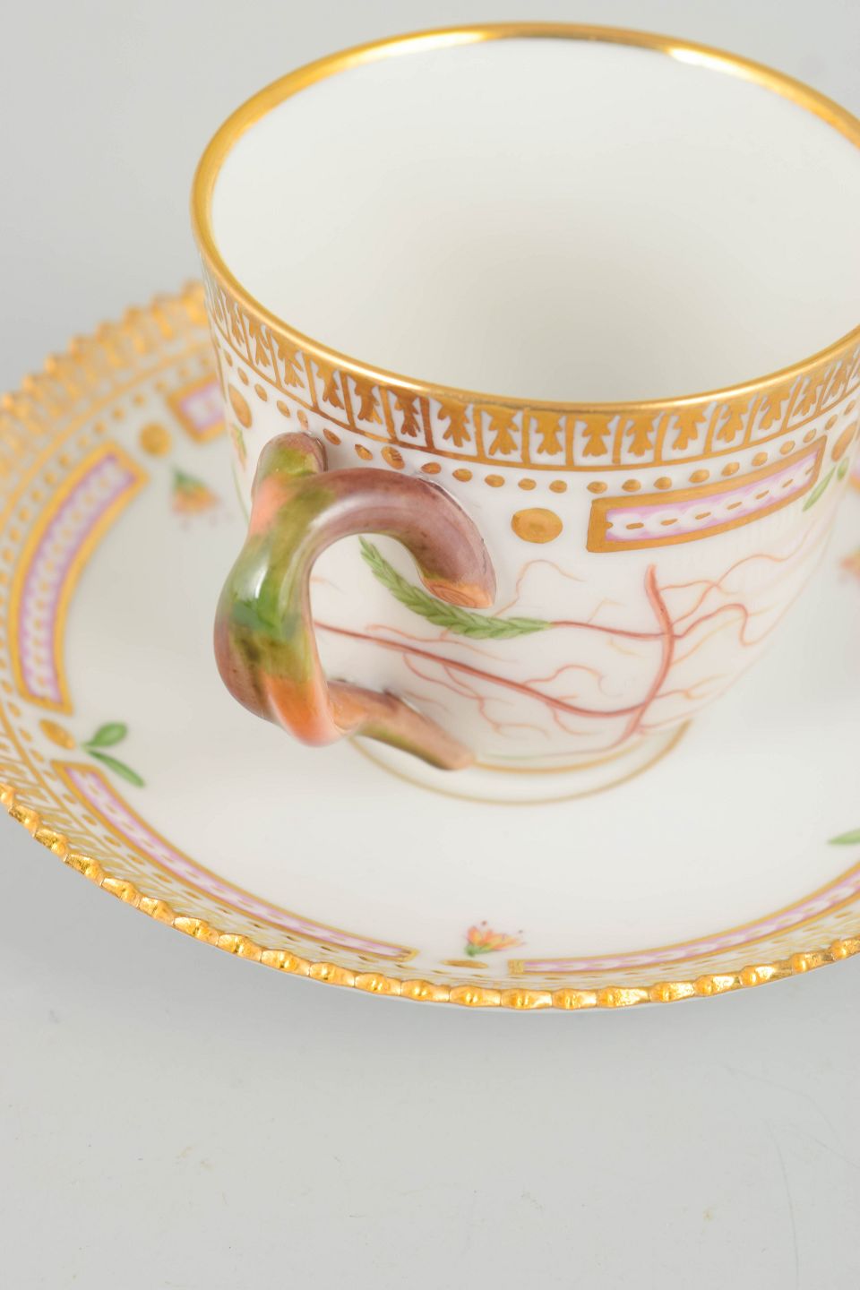 Elegant moccakop med tilhørende underkop i det ikoniske Flora Danica-stel. Koppen er håndmalet med botanisk motiv gengivet efter Flora Danica-værket og udført i stellets karakteristiske, raffinerede formsprog med dekorativ kant. En klassisk og eksklusiv kaffekop.