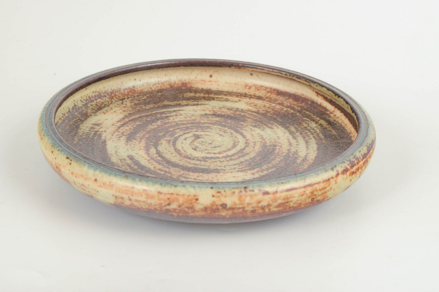 Stor, lav skål udført i stentøj med markant koncentrisk dekoration og levende, krakeleret glasur i lyse sandfarver kombineret med mørkebrune og grå nuancer. Den cirkulære opbygning og det tydelige spil i glasuren giver et stærkt grafisk og samtidig organisk udtryk, karakteristisk for Royal Copenhagens stentøjsproduktion i perioden.