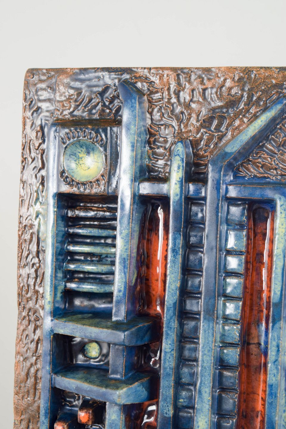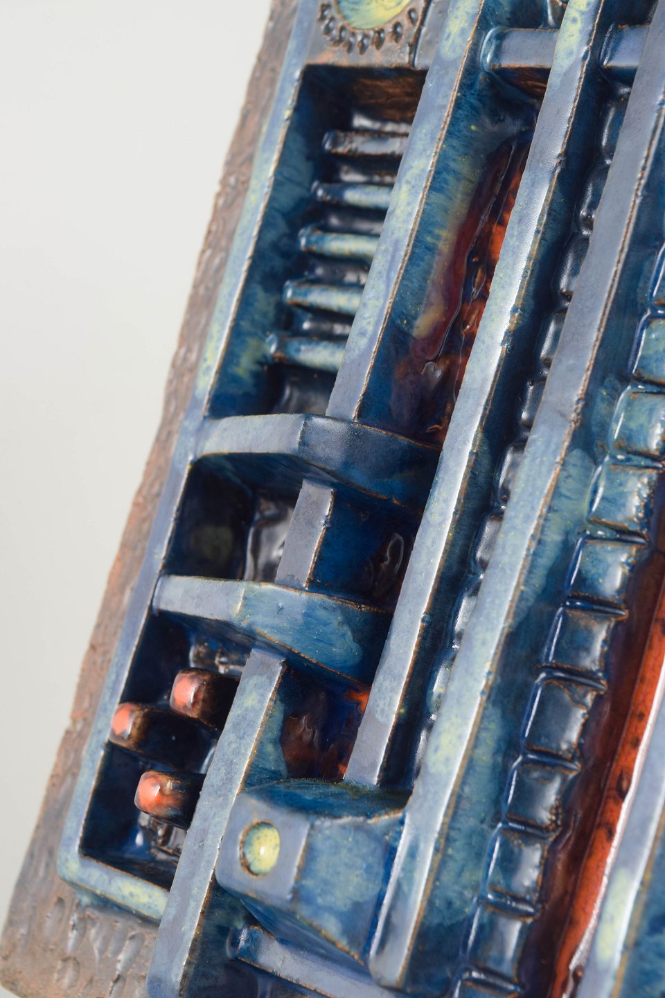 Abstrakt vægrelief udført i stentøj med markant, arkitektonisk opbygning og kraftig reliefvirkning. Kompositionen er præget af geometriske former og strukturerede felter, kombineret med dyb glasur i blå, kobberbrune og rustrøde nuancer, typisk for europæisk studiokeramik i 1970’erne.
