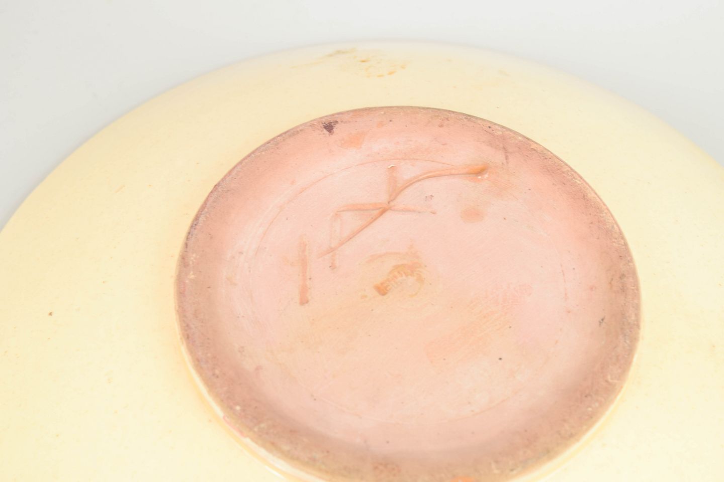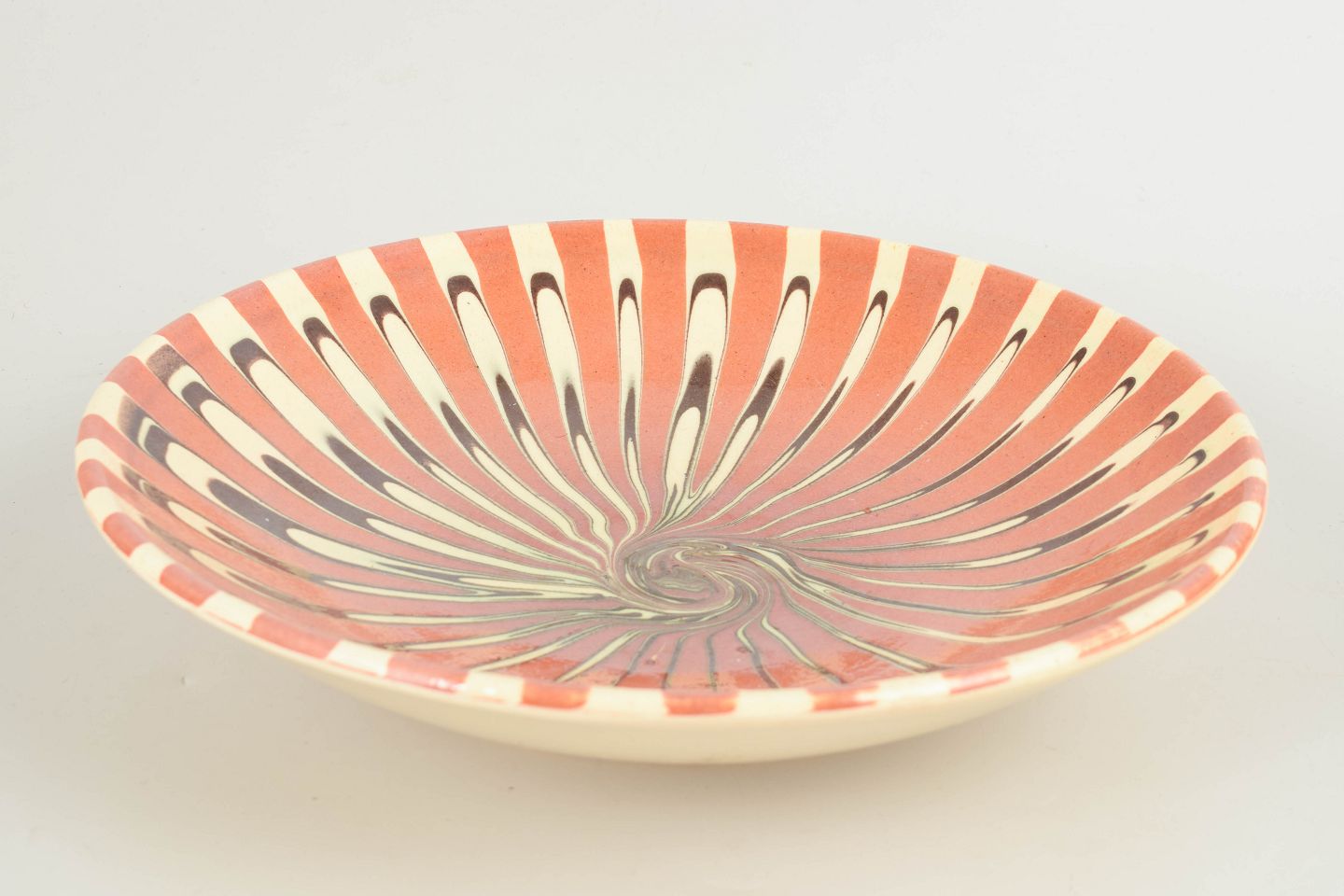 Dekorativ skål i fajance med karakteristisk slynget slipdekoration i rosa, creme og mørke kontrasttoner. Den brede, lavtbuede form fremhæver den dynamiske, spiralformede dekoration, som er typisk for Kählers kunstneriske produktion i mellemkrigstiden. Et fint eksempel på dansk keramikkunst fra 1930’erne.