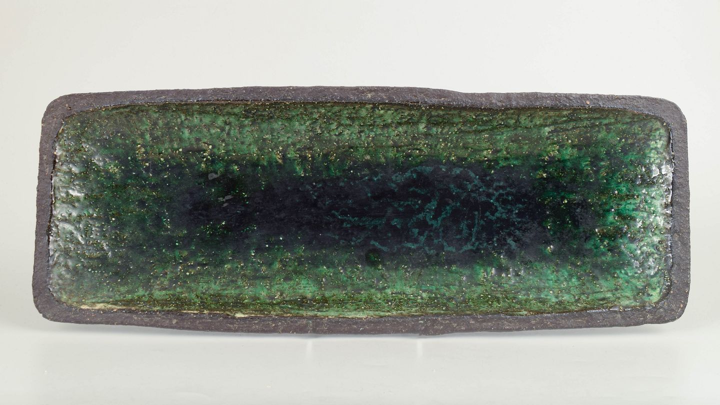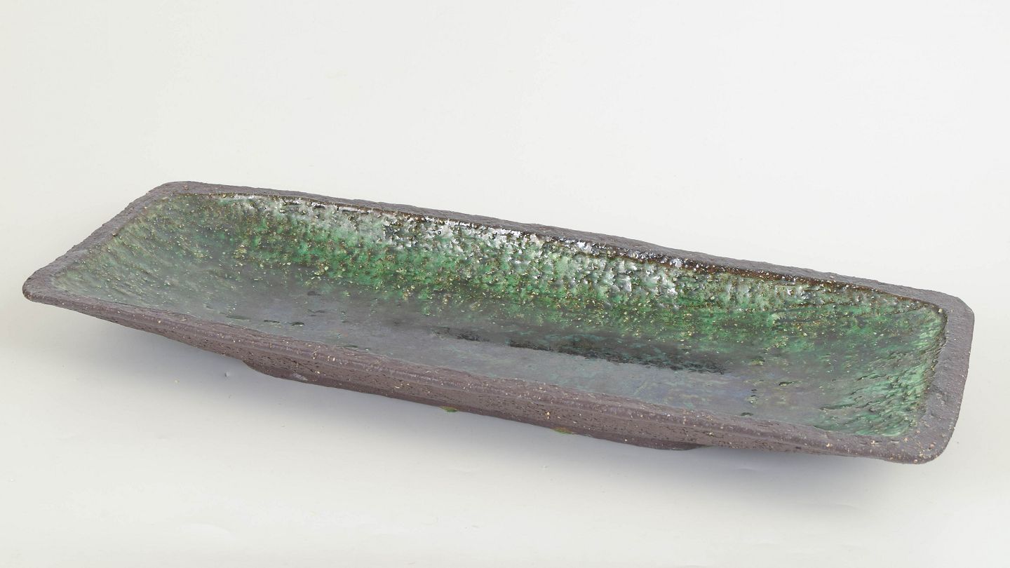 Aflangt, hånddrejet stentøjsfad med let buet form og rå, uglaseret yderside. Indersiden er dækket af en levende grøn glasur med varierende dybde og struktur, karakteristisk for dansk studiokeramik fra perioden. Et dekorativt og funktionelt fad, velegnet til servering eller som skulpturelt midtpunkt.