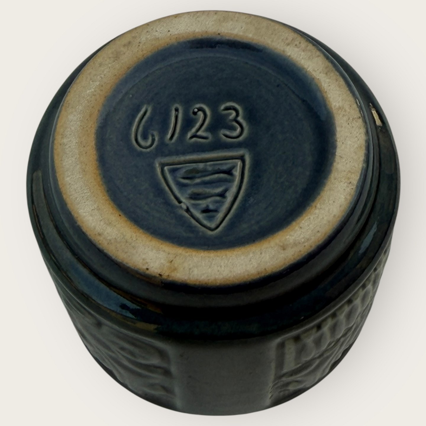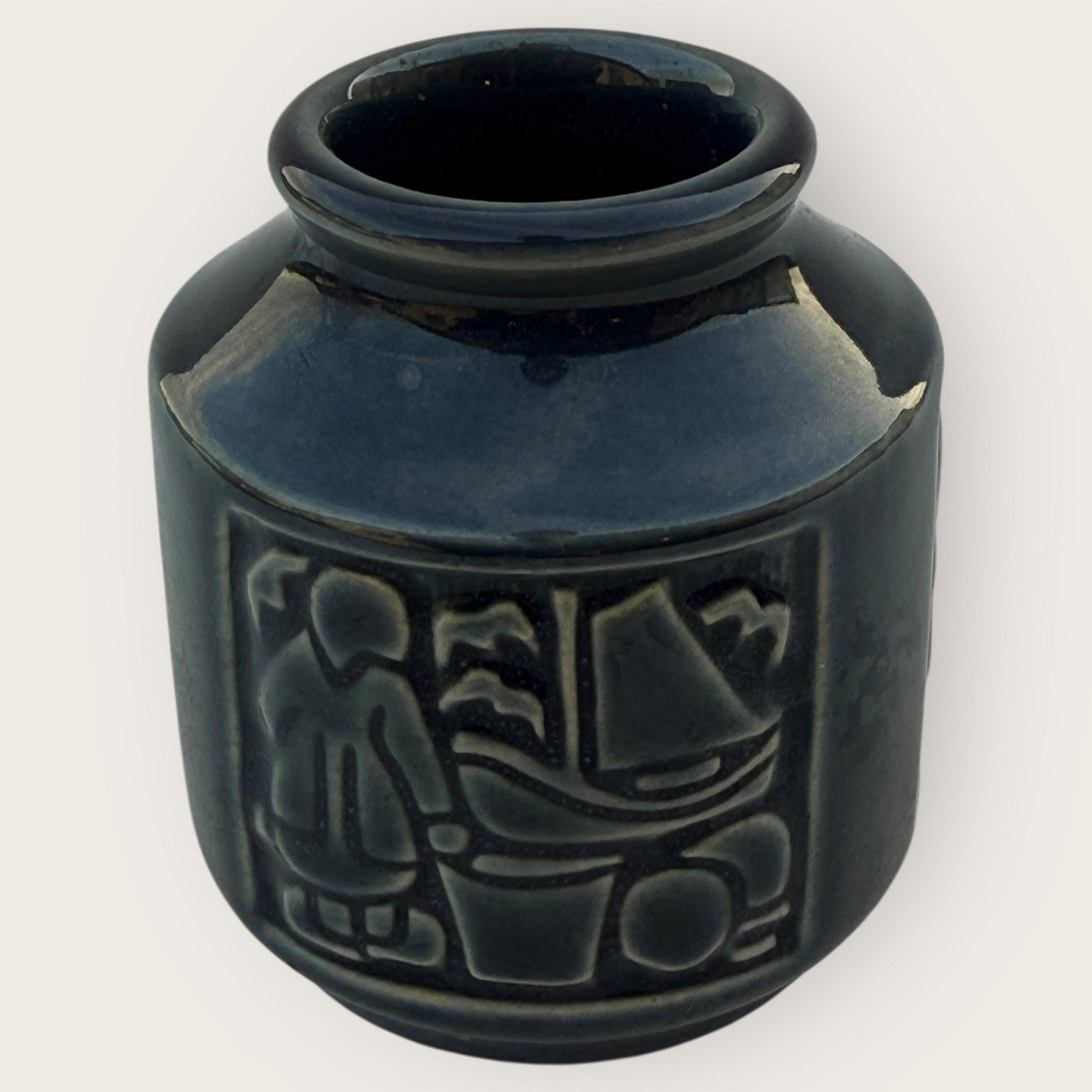 Bornholmer Keramik, Michael Andersen, Kleine Vase mit Motiven aus Bornholm, Räuchereien, Fischerfrauen usw. Höhe 8 cm, Durchmesser 6,5 cm, Nr. 6123, guter Zustand.