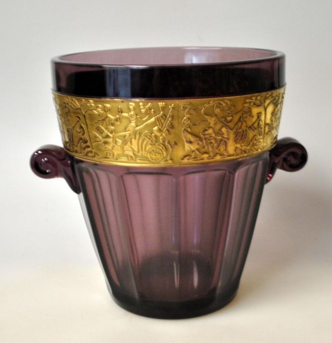 Moser, Ludvig & Söhne, Karlsbad, 1920er Jahre: Ein Paar Eisbehälter. Violettes Glas mit geätztem Goldfries und dem Motiv „Krieger“. Höhe: 14 cm.