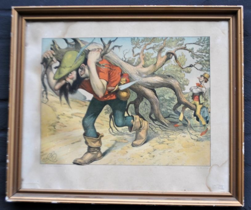 Moe, Louis (1877–1945) Dänemark: Komposition mit Mann, der einen Baum trägt. Farblithografie. Signiert im Druck. Herausgegeben von Alfred Jacobsen, Kopenhagen. 27,5 × 36 cm.