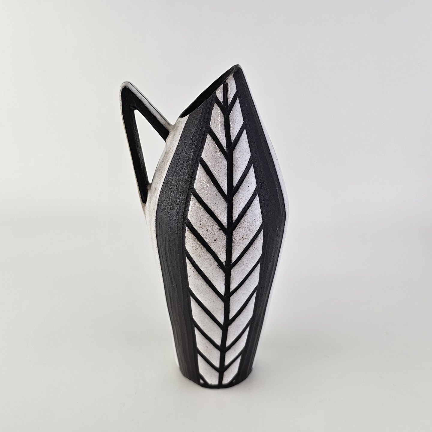 Text zugänglich auf Dänische: Vase med hank i keramik fra Negro serien med abstrakt motiv på mørk baggrund. Nr. 5513