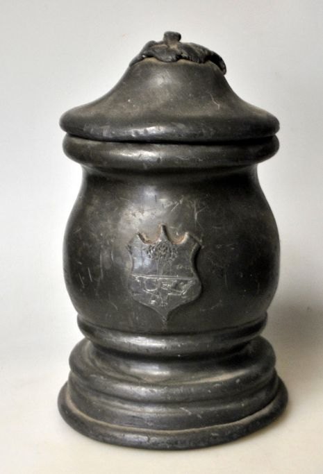 Barocke Tabakdose aus Zinn, 18. Jahrhundert. Seitlich mit Wappen. Innen mit Gewicht. Deckel mit Blattdekor. Höhe: 18 cm.