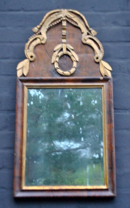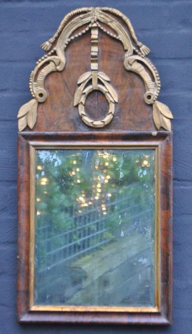 Dänischer Louis-XVI-Spiegel, Nussbaumfurnier, um 1780. Höhe: 70 cm. Breite: 34 cm.