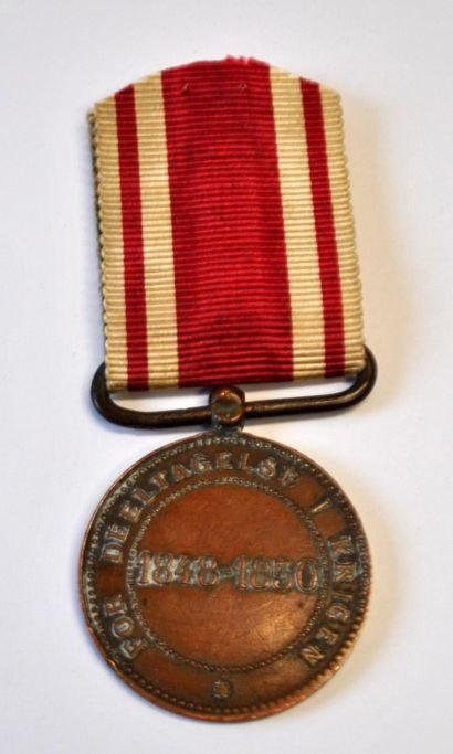 Medaille für die Teilnahme am Krieg 1848–1850. Kupfer. Inschrift: Für die Teilnahme am Krieg 1848–1850. Mit dem Profil von Friedrich VII. Medailleur: Alphee Dubois. Bandlänge: 4 cm. Medaillendurchmesser: 3 cm.