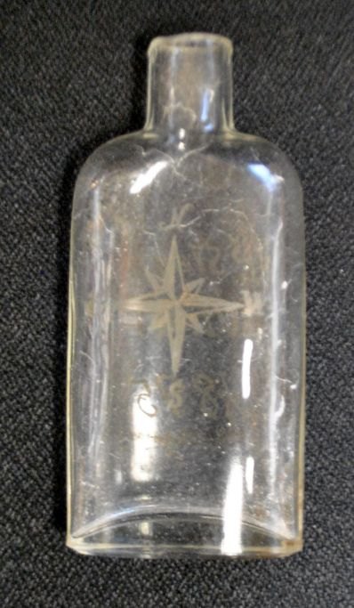 Glas-Taschen flasche, 1895. Mit Namen und Kompass graviert. L: 13 cm.