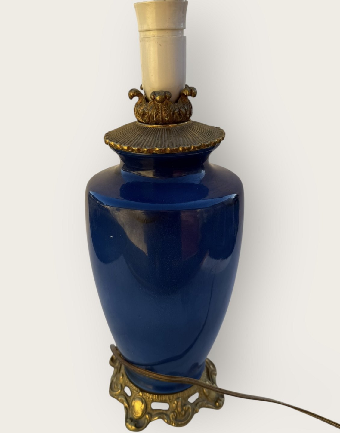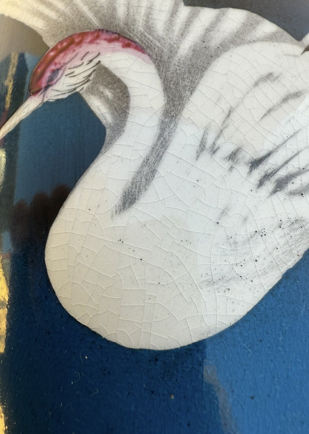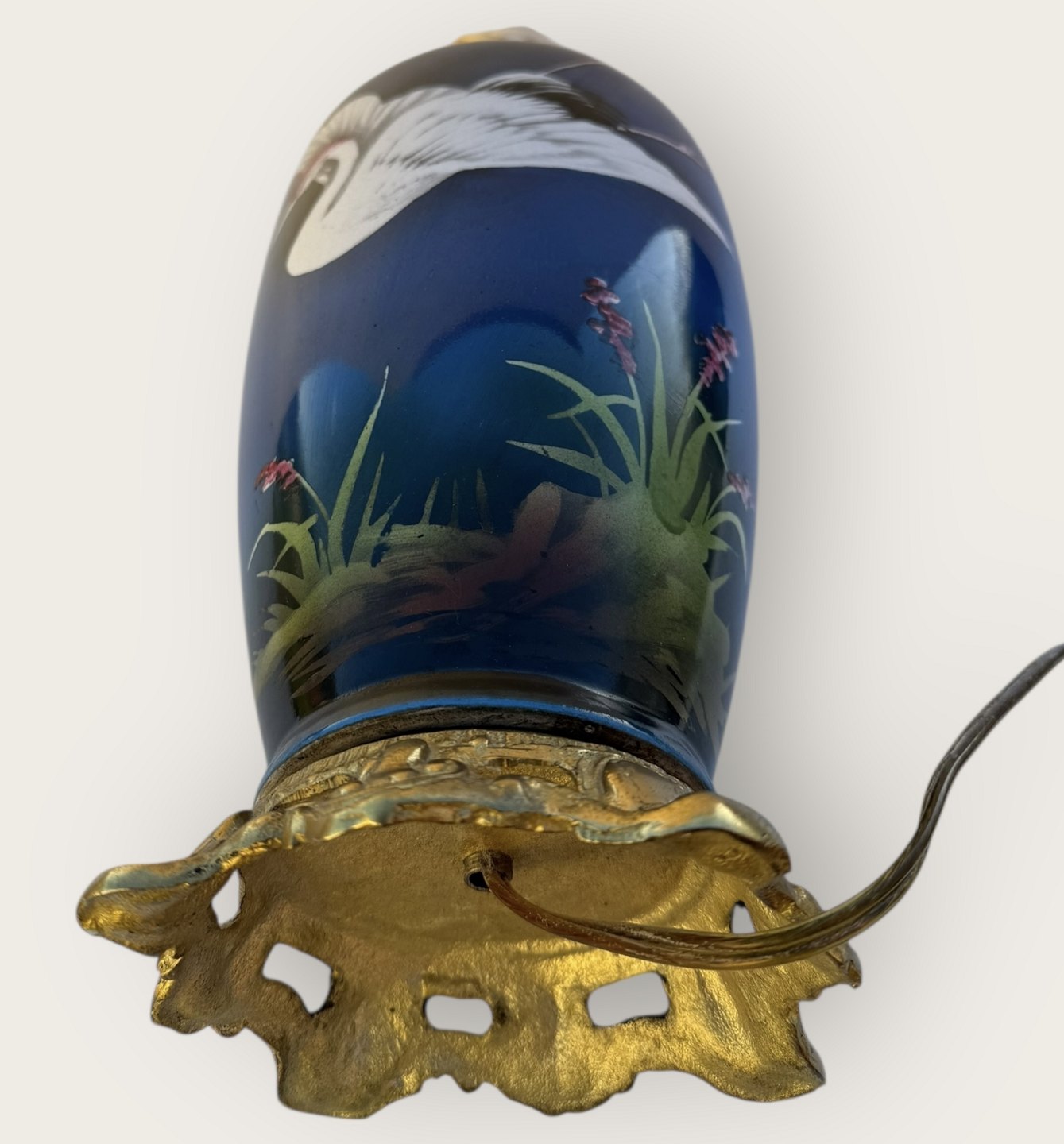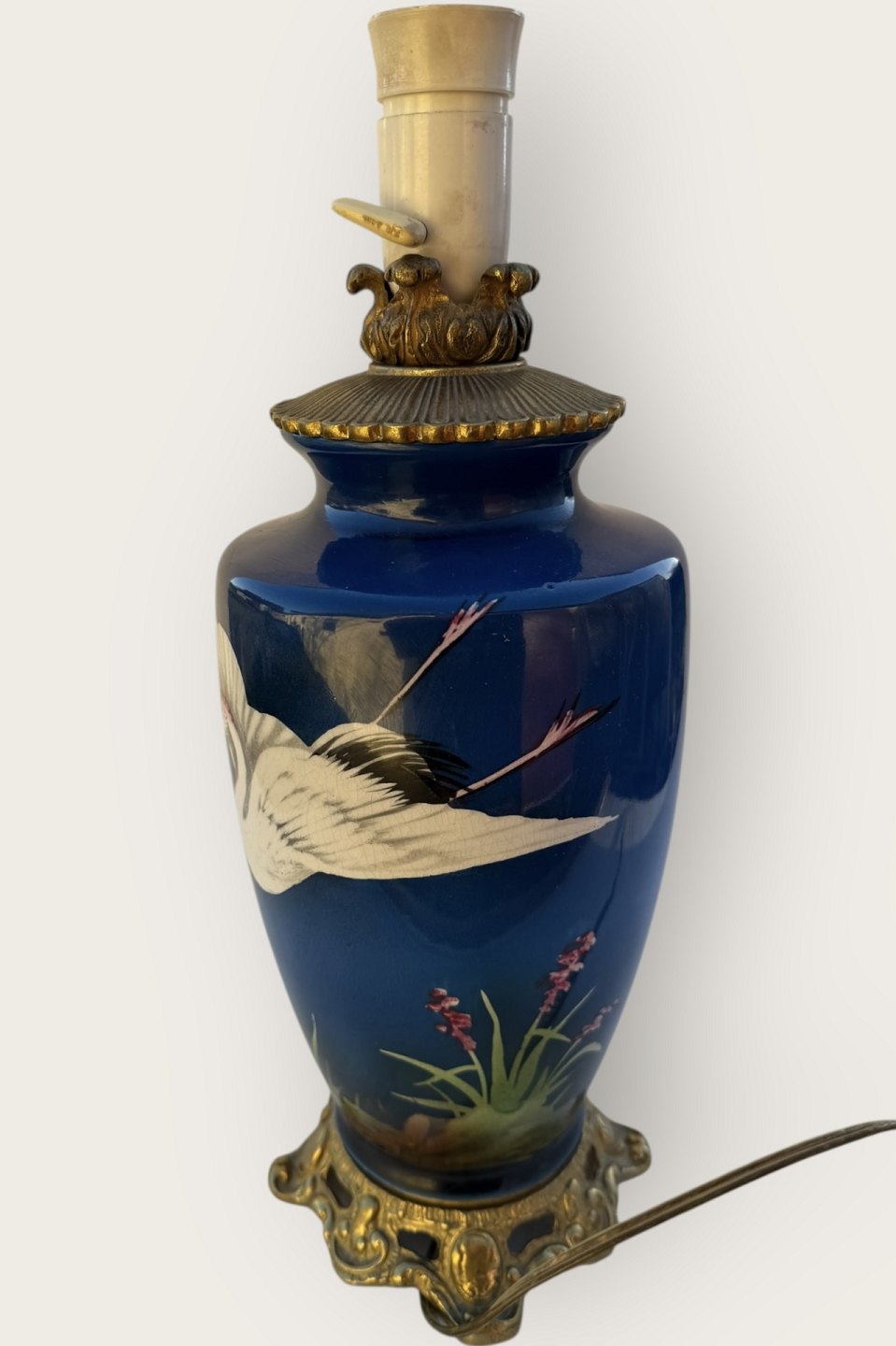 Große Tischleuchte mit fliegendem Vogel aus Porzellan und Messing, Höhe mit Fassung 39 cm. *Einige kleine Risse unter der Glasur (siehe Foto), ansonsten in sehr gutem Zustand.