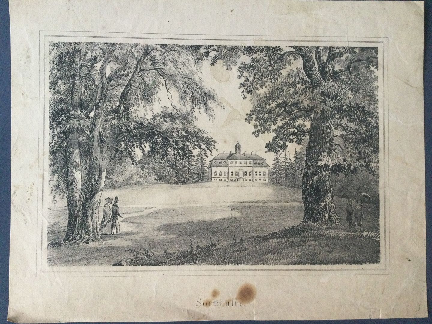 Text zugänglich auf Dänische: Tryk efter kobberstik af Jens Holm efter tegning af H.G.F. Holm - Sorgenfri Slot ca. 1840.