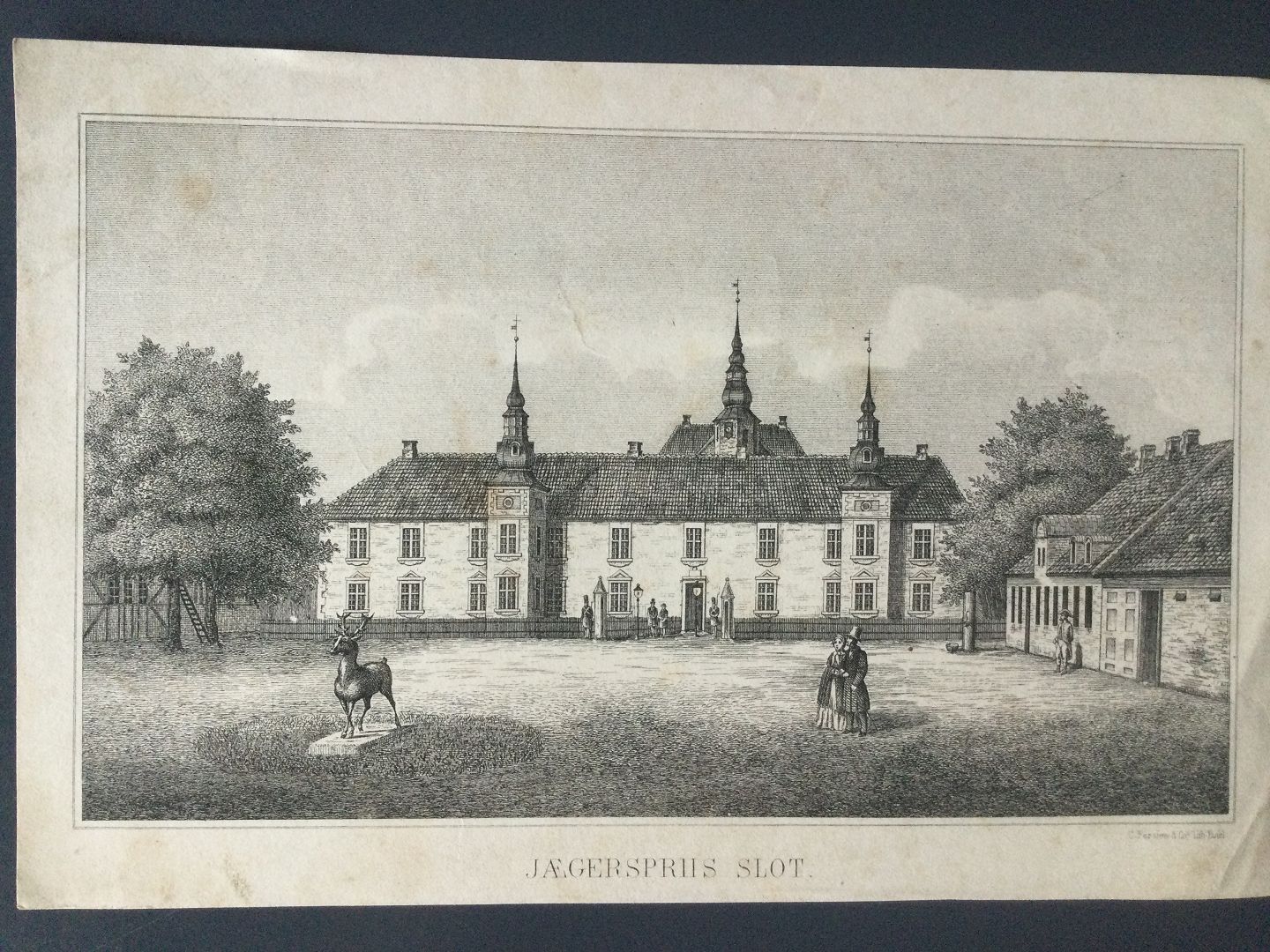 Text zugänglich auf Dänische: Litografi af Christian Ferslew - Jægerspris Slot ved Frederikssund.