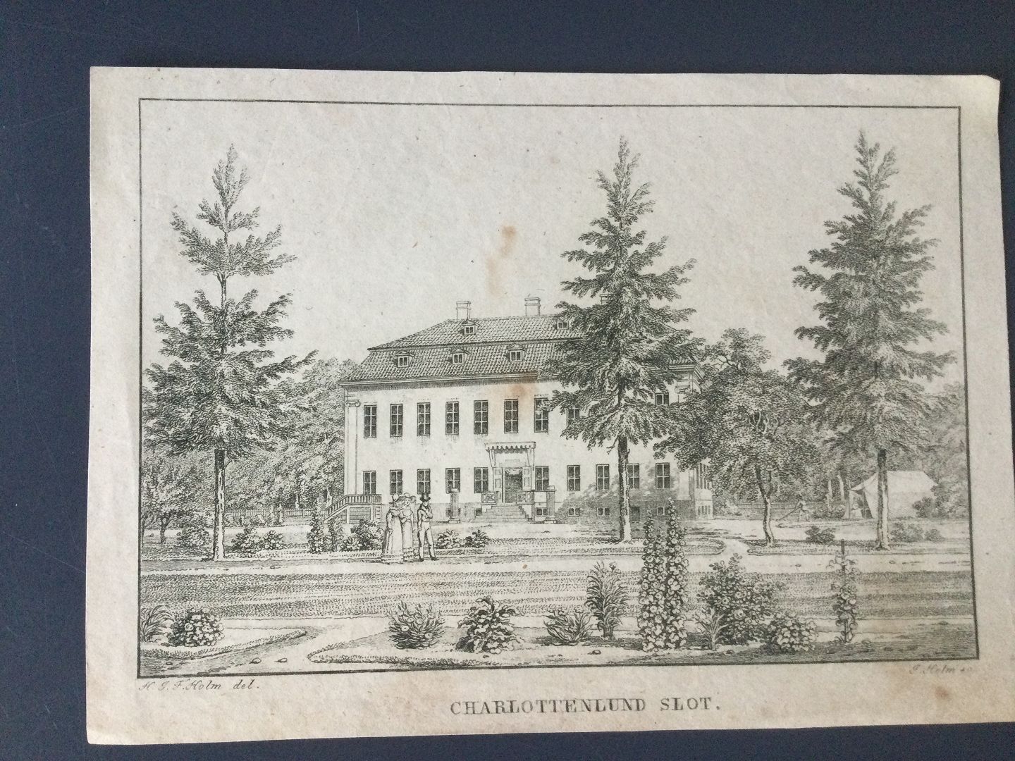 Text zugänglich auf Dänische: Radering efter kobberstik af Jens Holm efter tegning af H.G.F. Holm - Charlottenlund Slot.