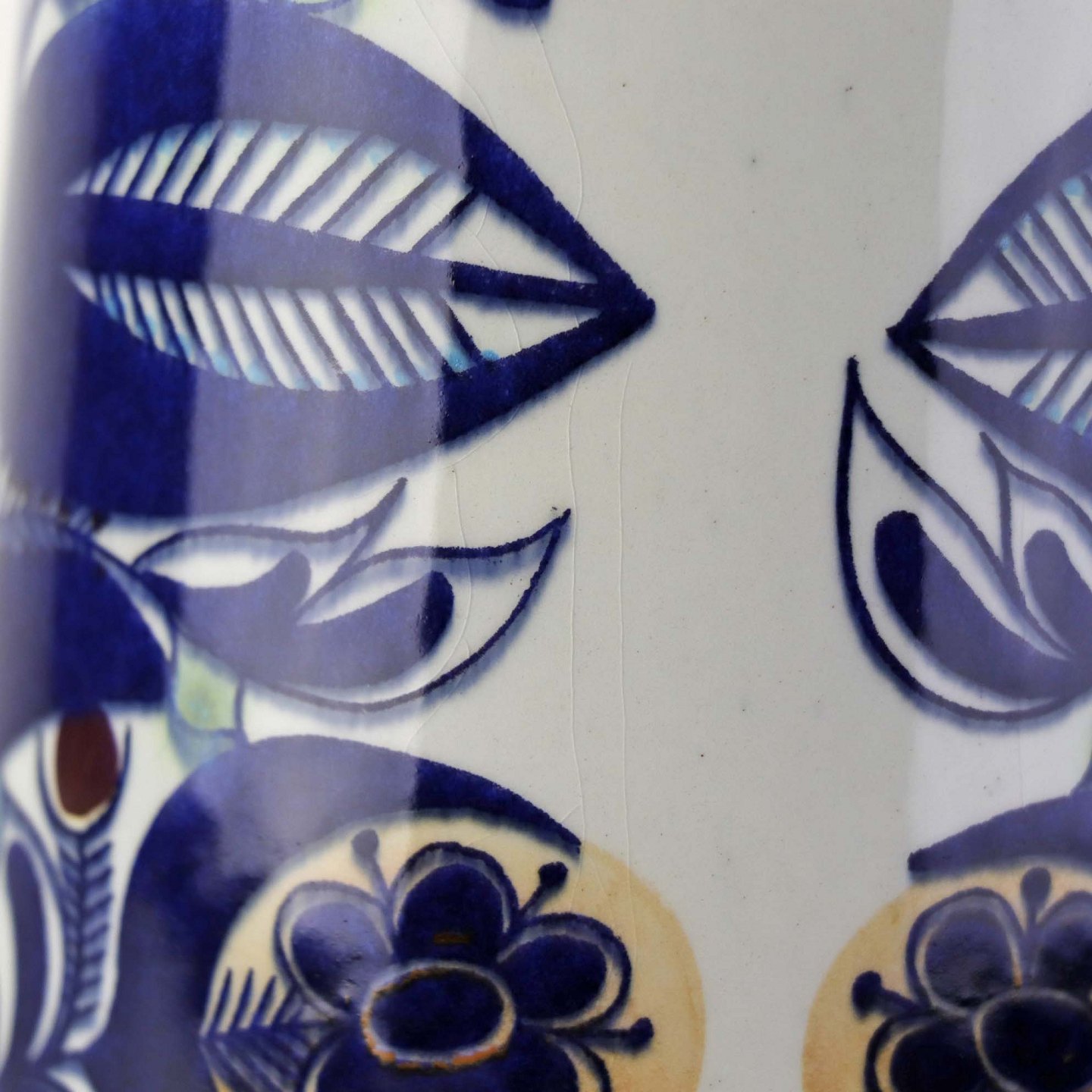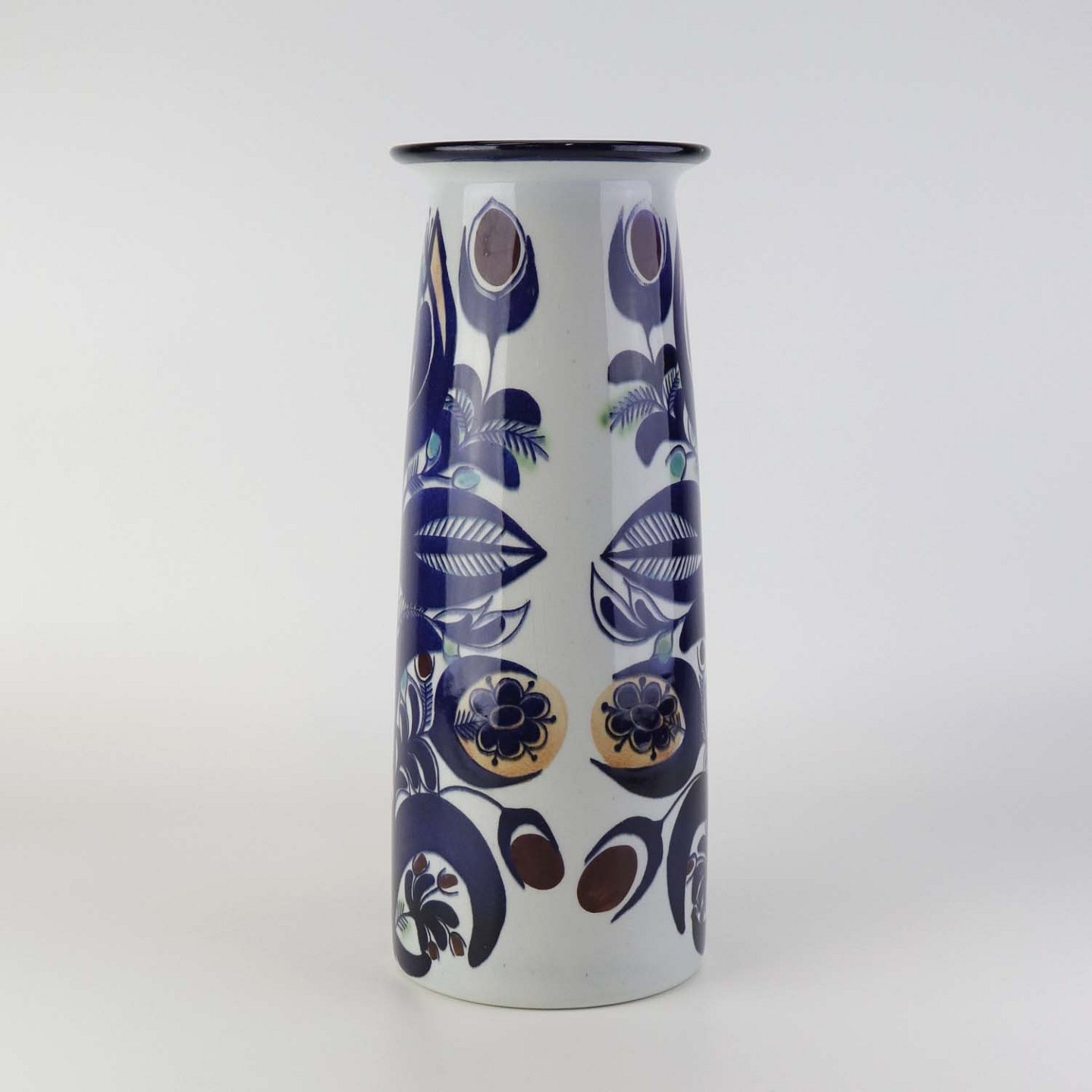 Vase i fajance fra Tenera serien med let krakkeleret glasur og blåt abstrakt blomstermønster. Nr. 207/2967