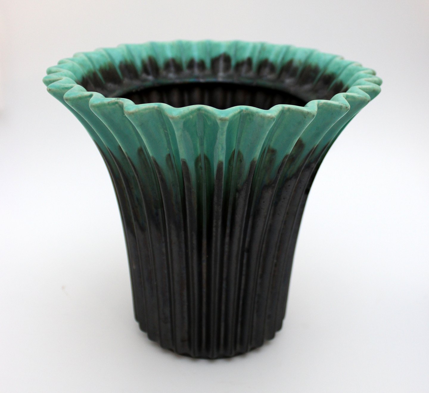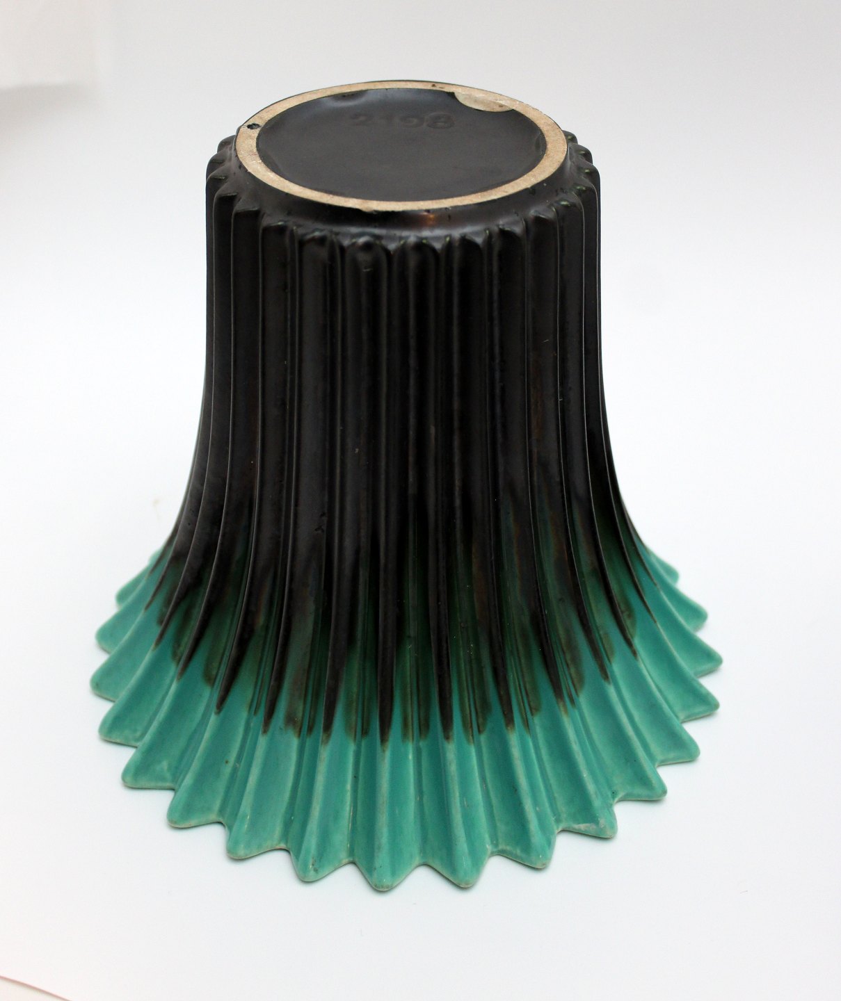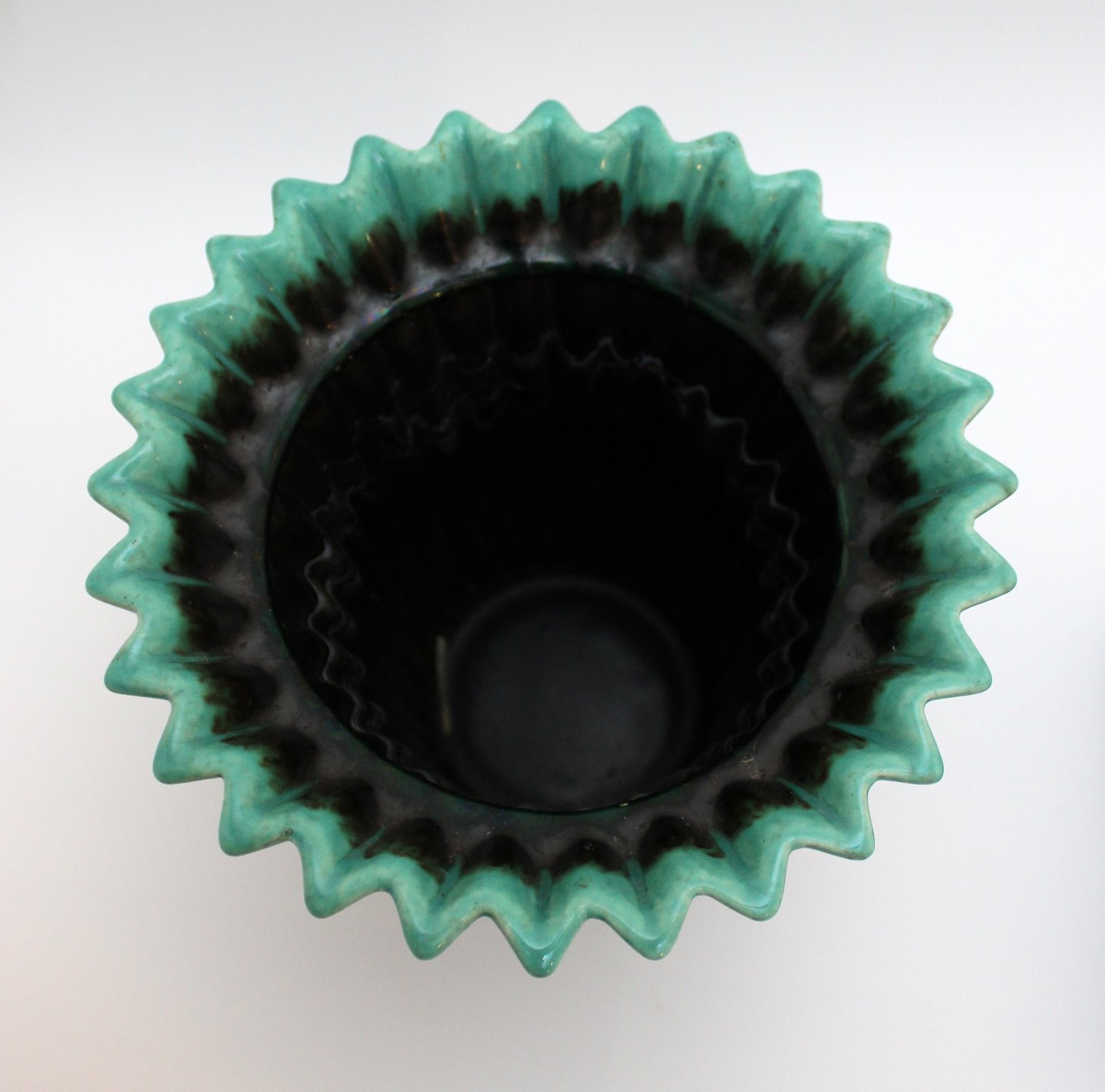 Text zugänglich auf Dänische: Sort rillet keramik vase med turkis kant. Nr. 2198. Kender ikke keramikeren eller fabrikken. Men vasen er meget dekorativ og anvendelig. Fin stand, bred kalkagtig rand indvendig. Højde 17,5 cm. Øverste diameter 19,5 cm. Nederste diameter 10 cm. Pris: 375 kr. Lager: 1