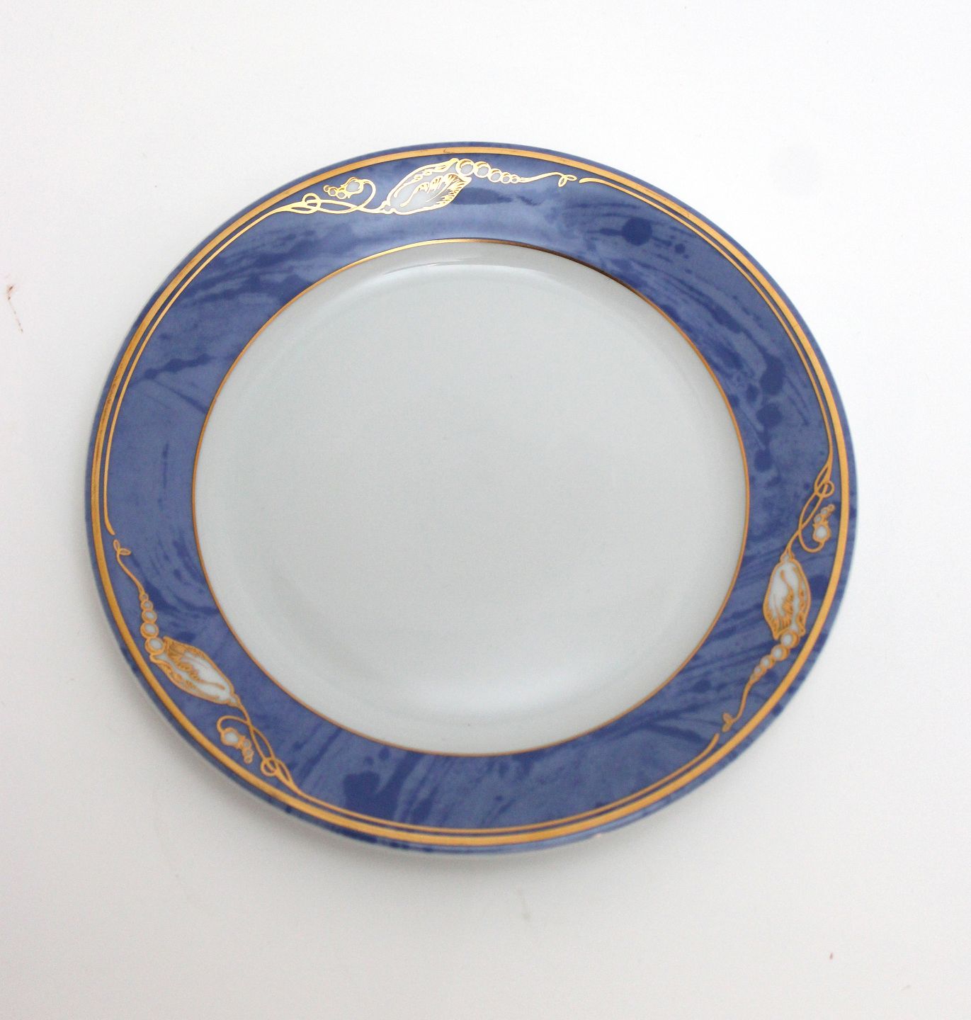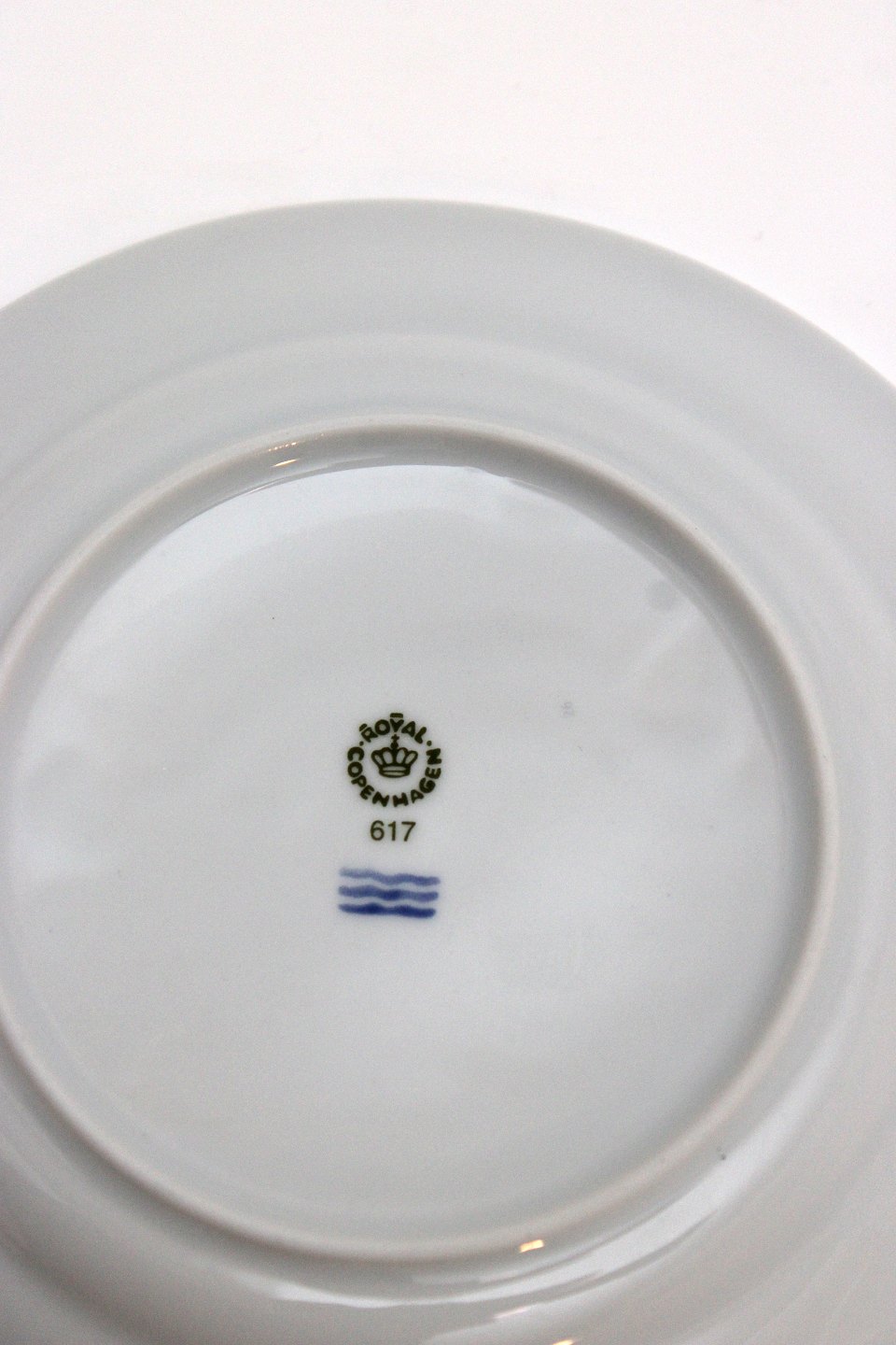 Text zugänglich auf Dänische: Royal Copenhagen, Blå Magnolia. Blå marmoreret bort dekoreret med gylden blomsterknop. Designet af Flemming Eskildsen. Stor kagetallerken. Diameter 17 cm. Nr. 617. I. sortering. Pris: 50 kr. stk. Lager: 6