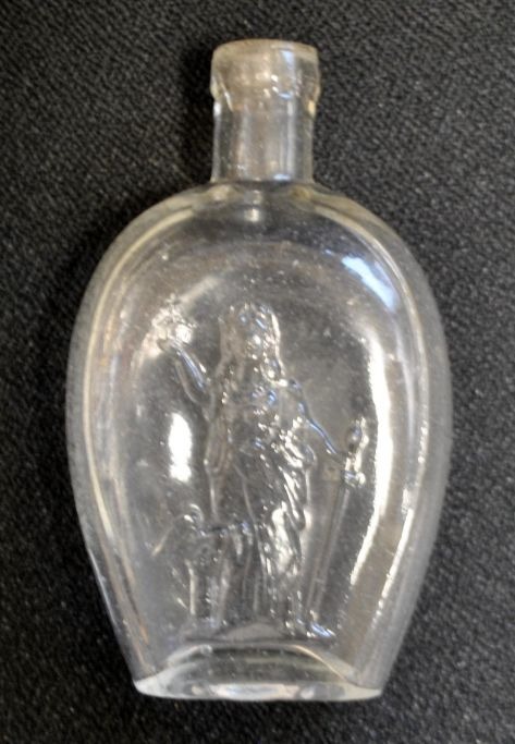 Deutsche Taschenlerche aus Klarglas mit Germania-Motiv, 19. Jahrhundert. Am Boden geprägt mit „1/8 L“. Länge: 12 cm.