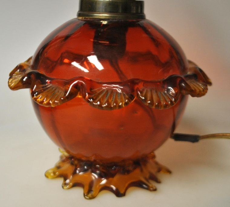 Petroleumlampe aus rotem Glas mit gelben Rändern, um 1900, Dänemark.