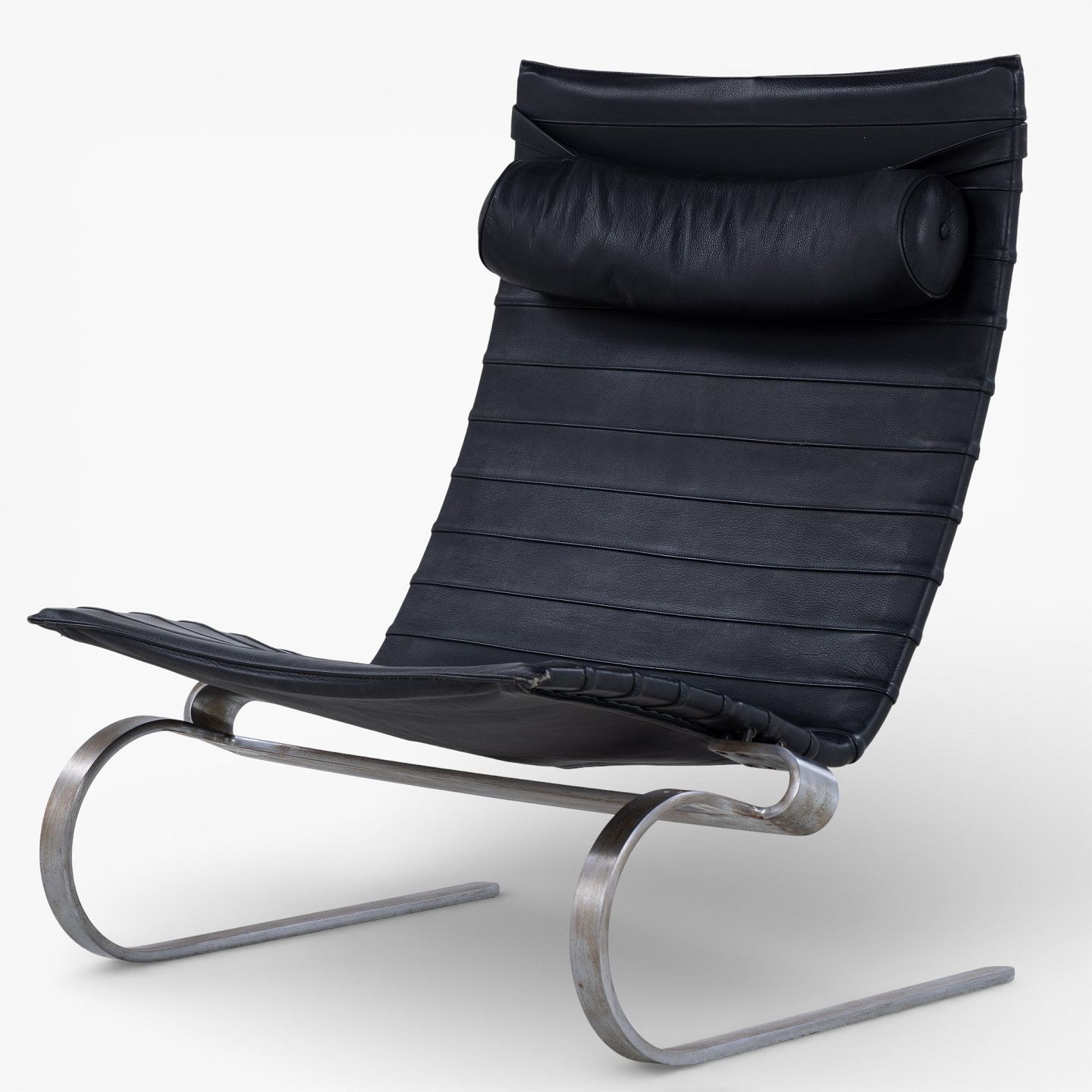 PK 20 - Lænestol i originalt sort læder med nakkehynde og stel af fjederstål. Formgivet i 1968.