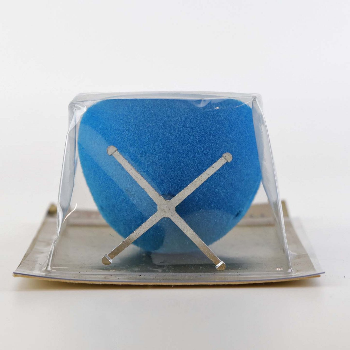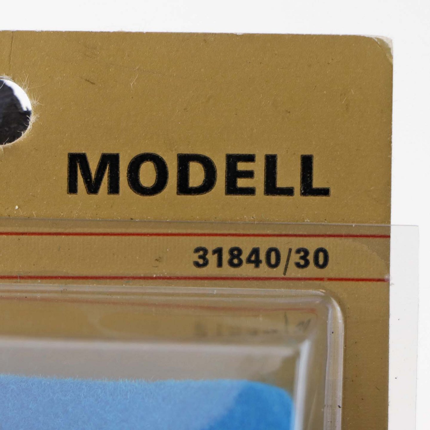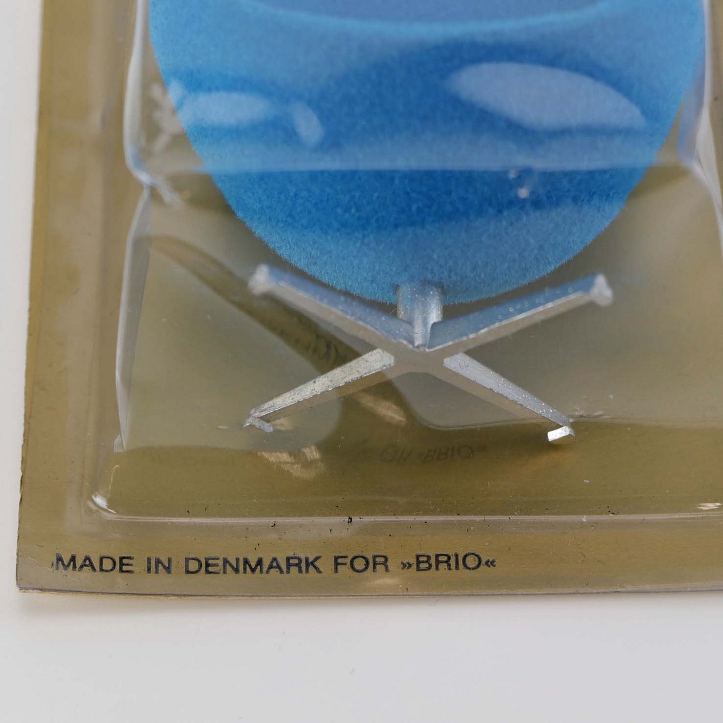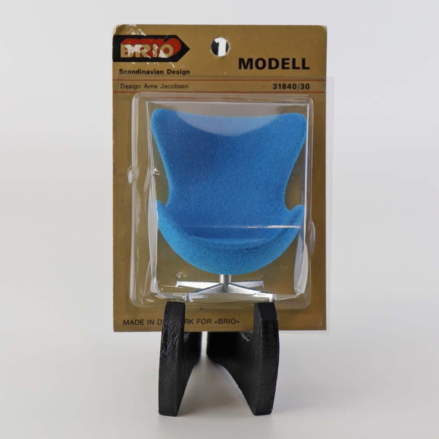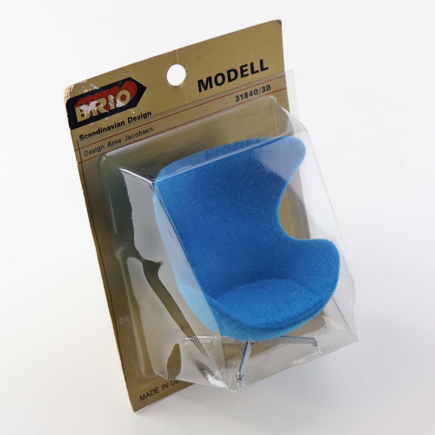 Blå miniature stol til dukkehus med model af Arne Jacobsen's lænestol Ægget. Model 31840/30