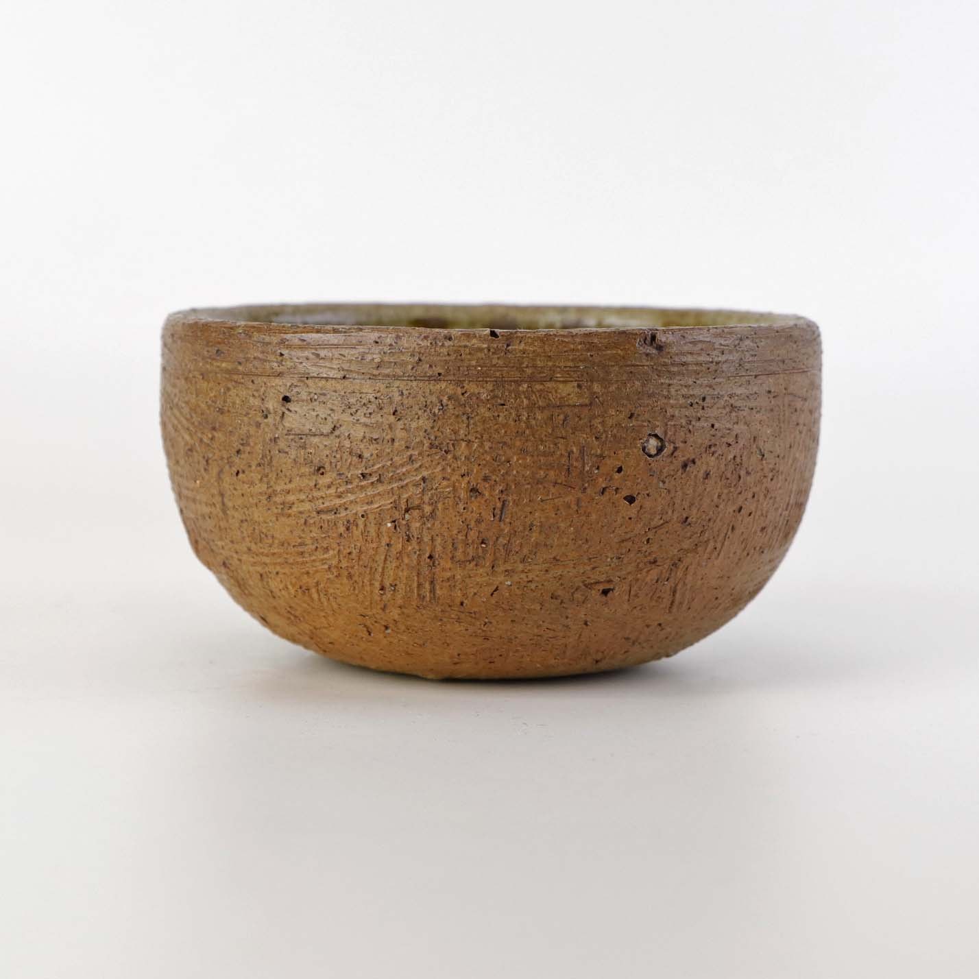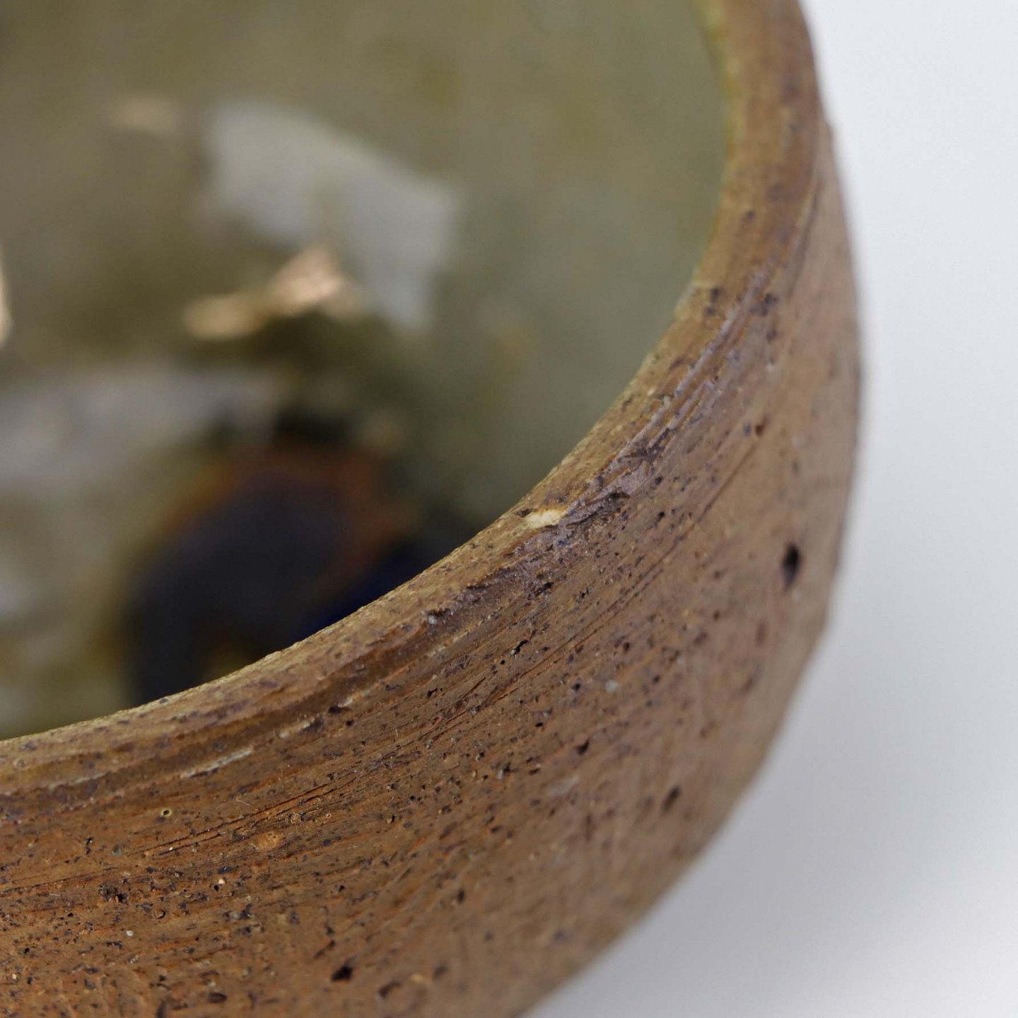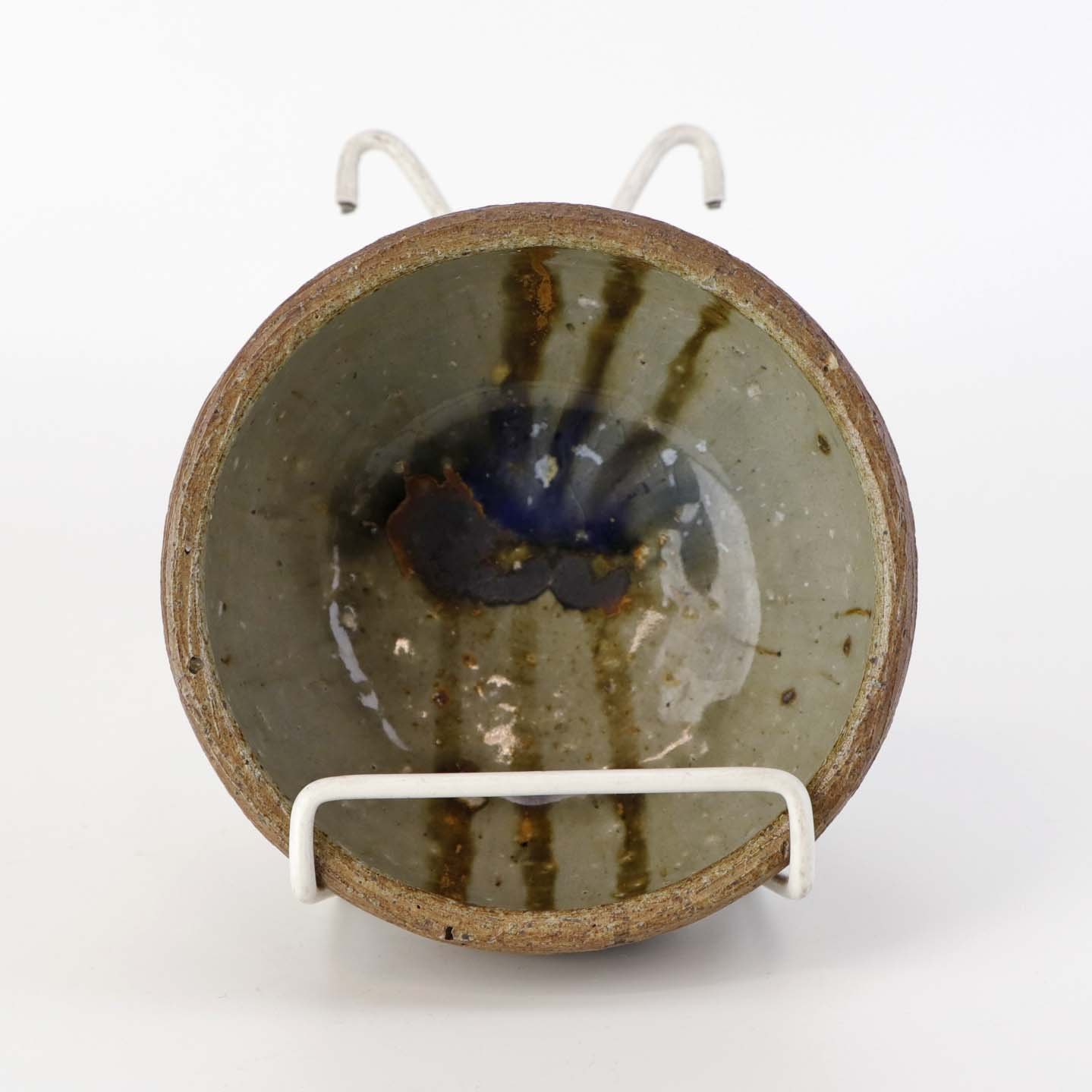 Lille rund skål i keramik. Glaseret indvendigt med i beige, brun og blå glasur.