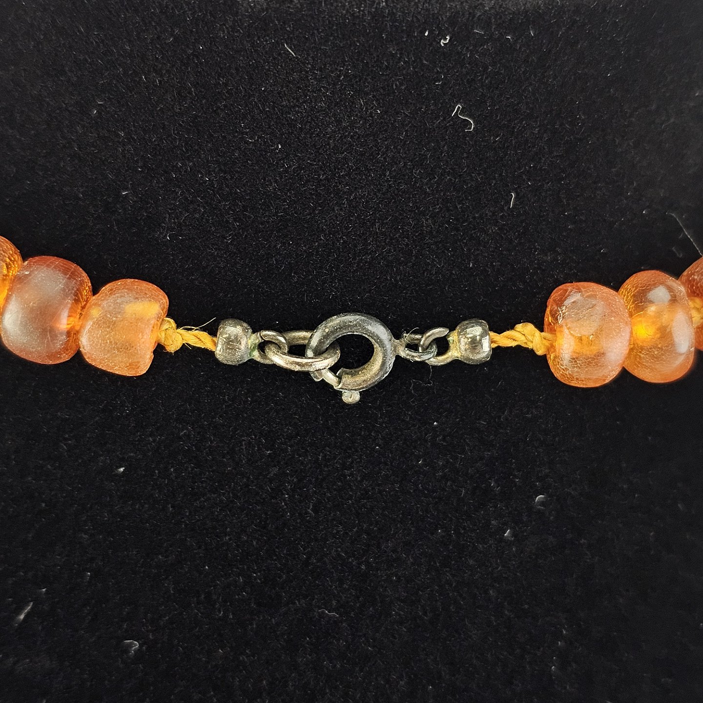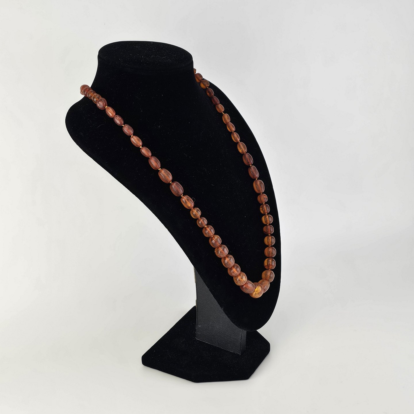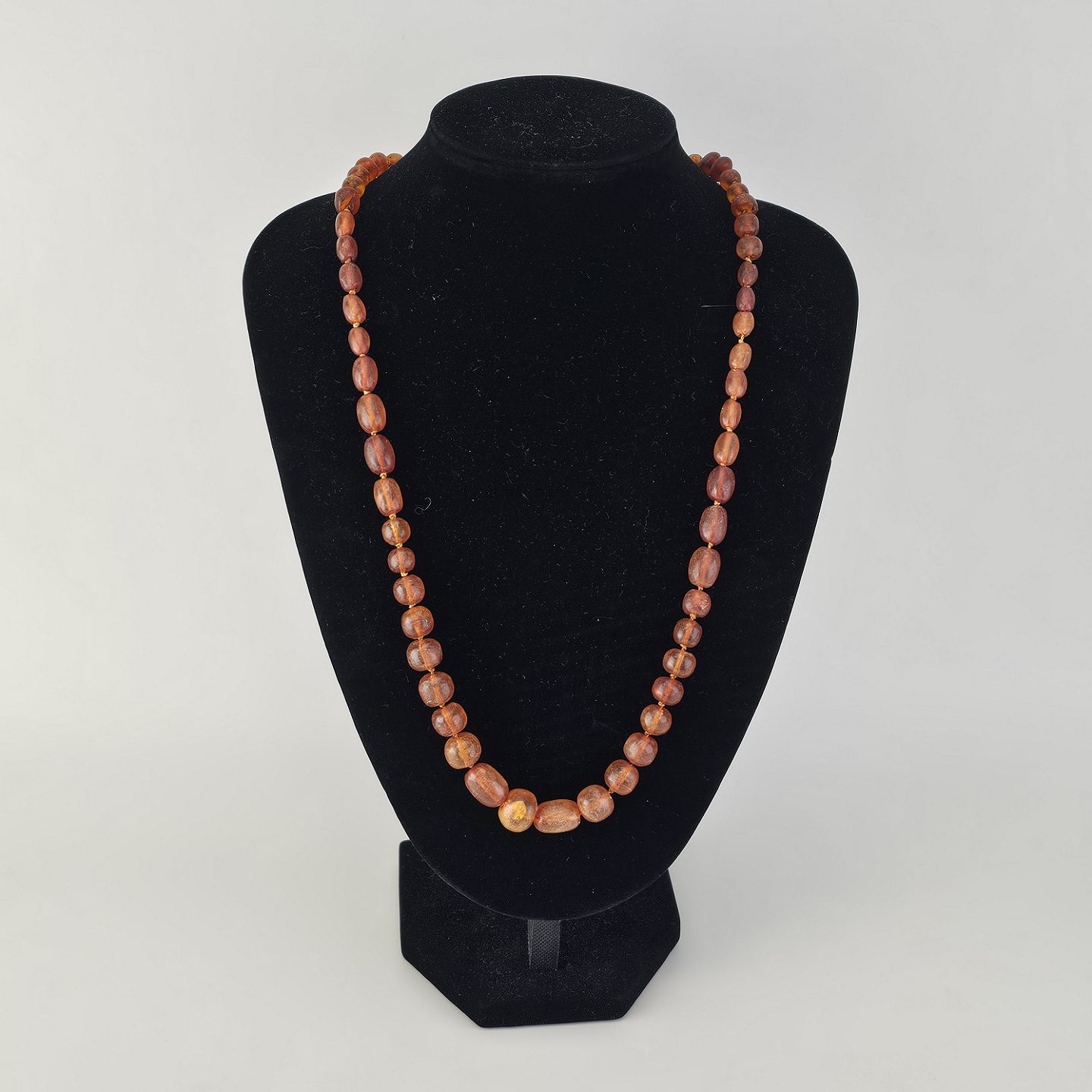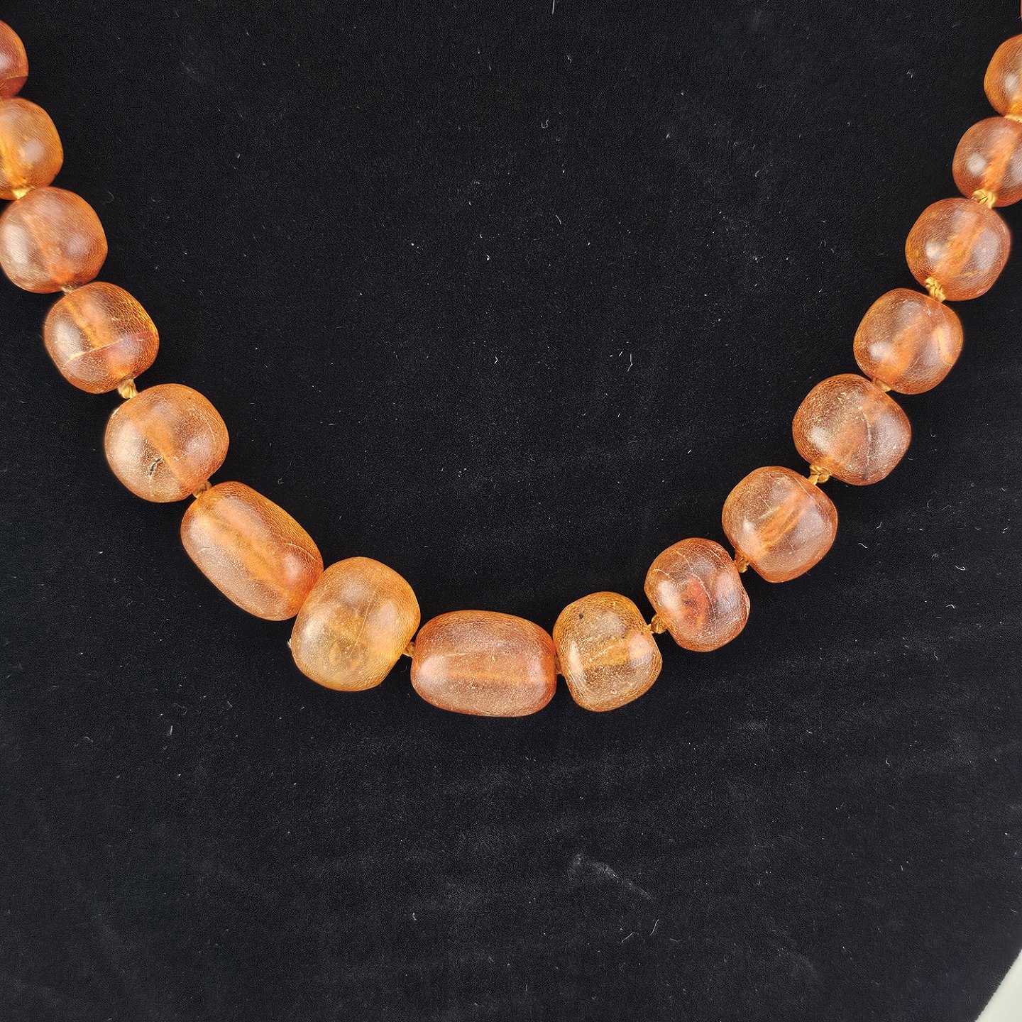 Halskæde med glatslebne ravstykker i varierende størrelse på snor, i alt 65 stykker rav