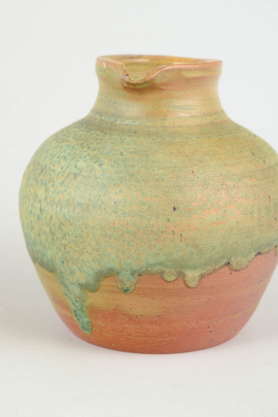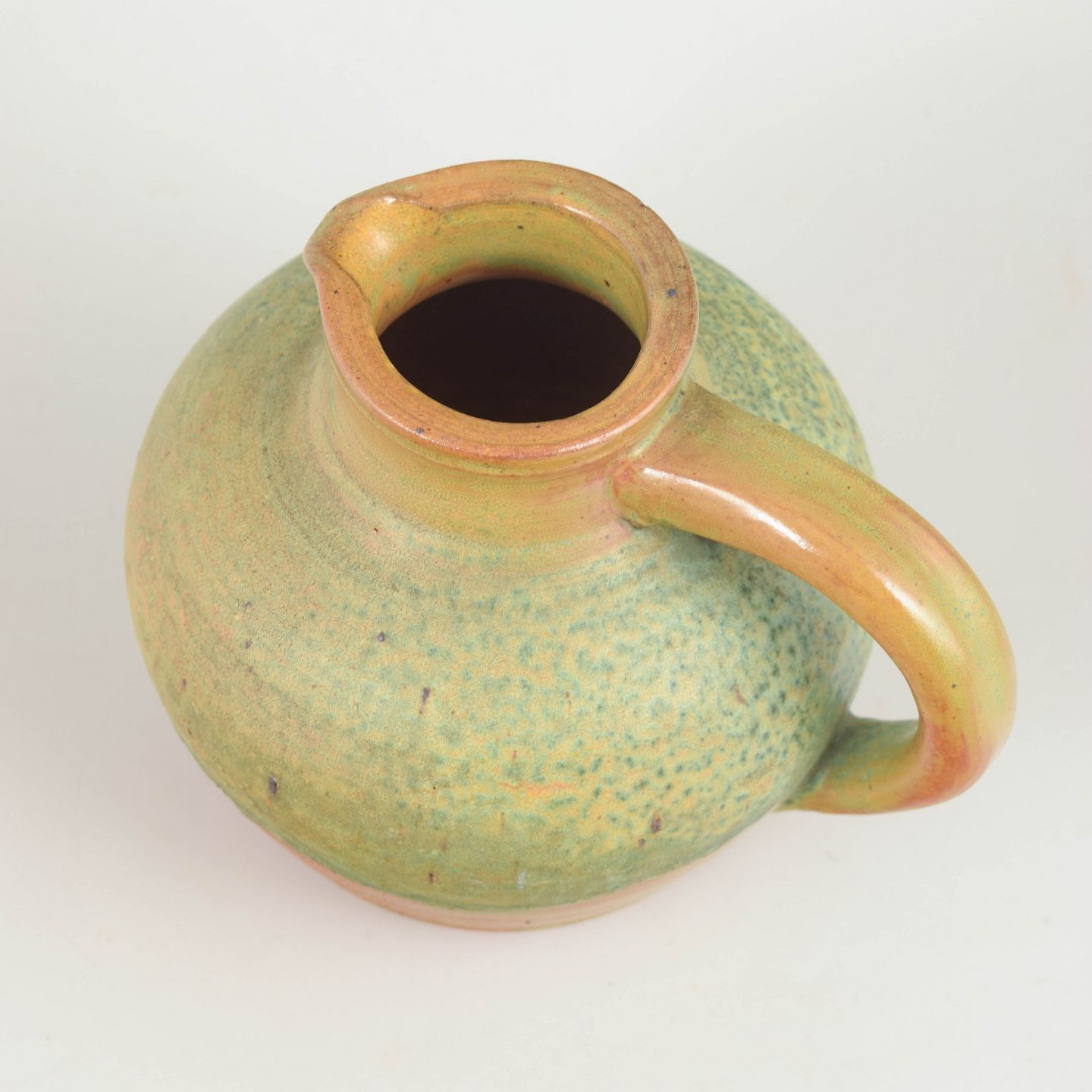 Kompakt og rundbuet kande udført i stentøj med tofarvet glasur, hvor en grønlig overglasur møder en varm, terrakottafarvet bund. Den bløde overgang mellem glasurerne og den integrerede hank giver et roligt og funktionelt udtryk.