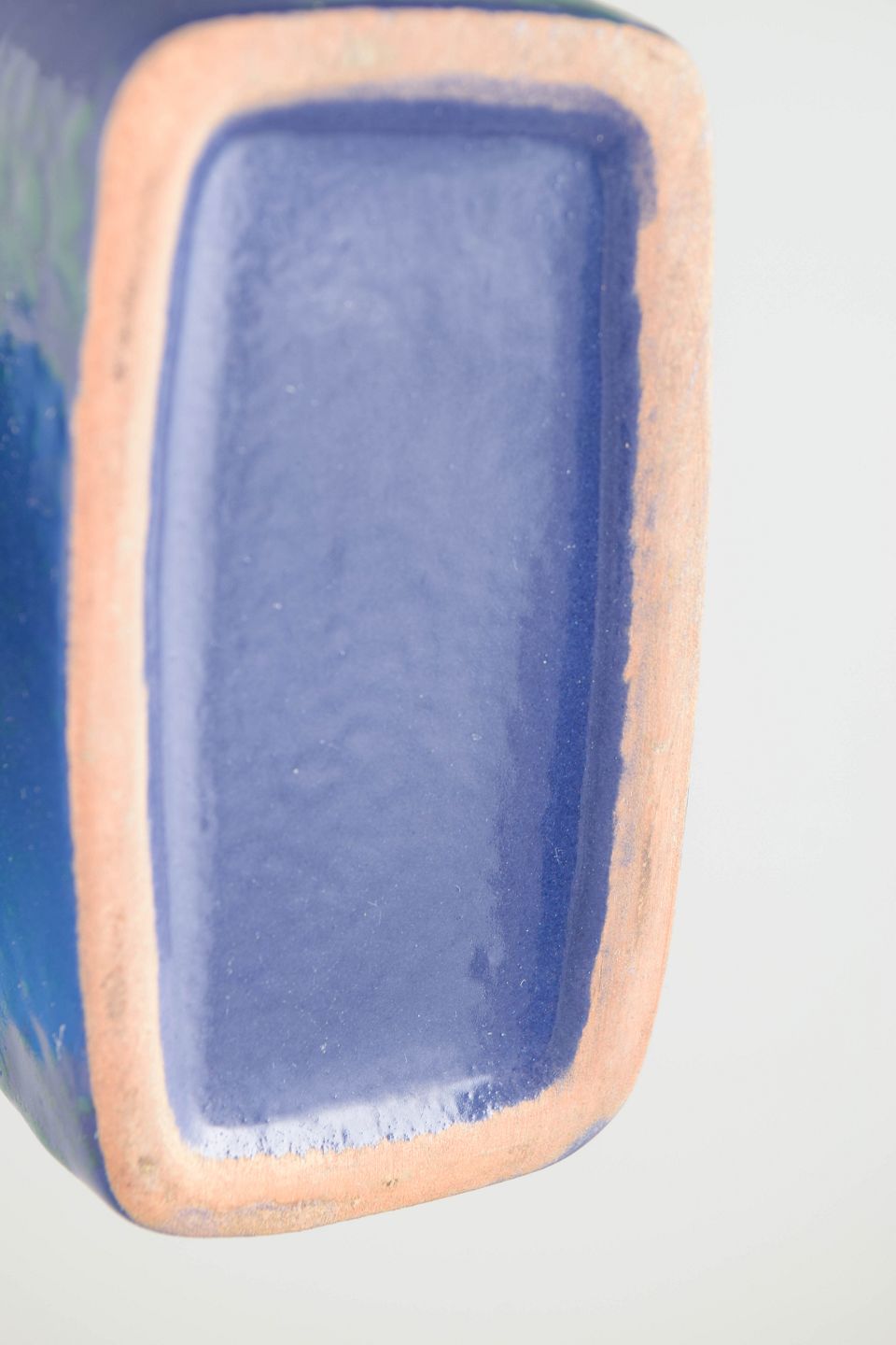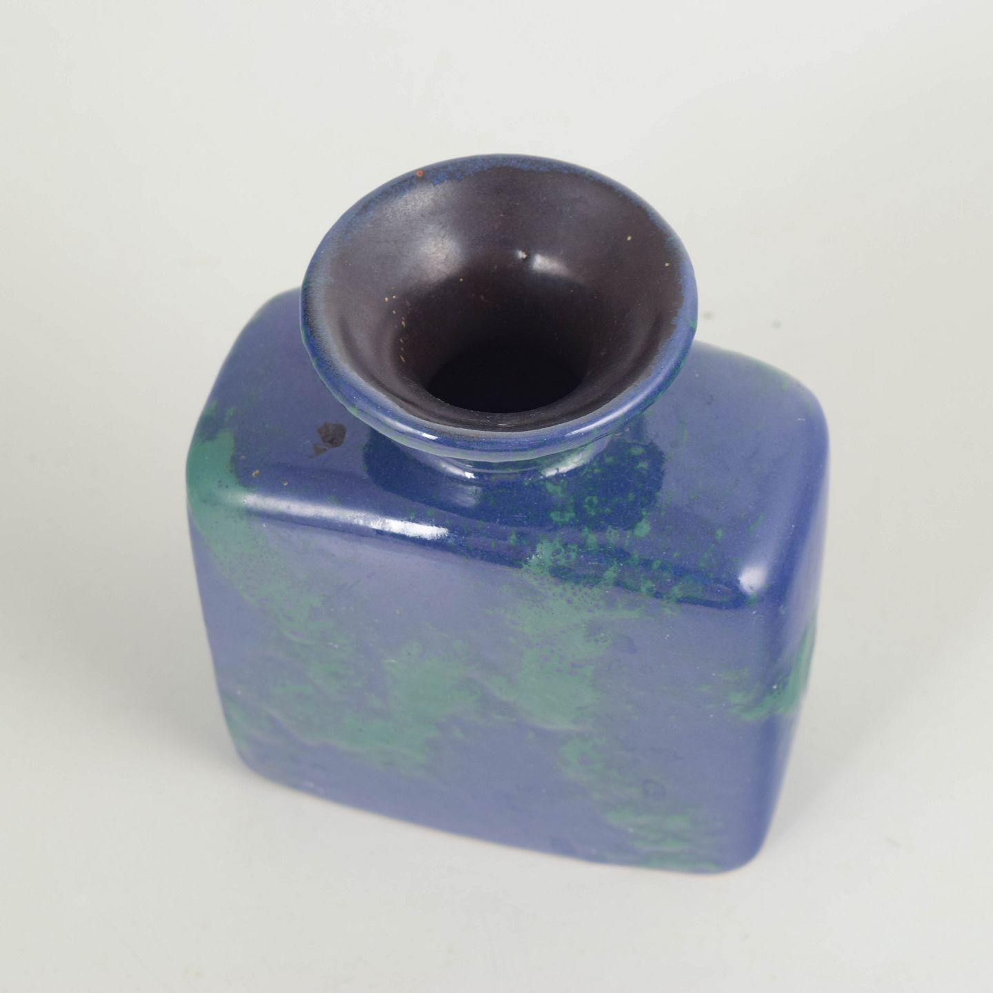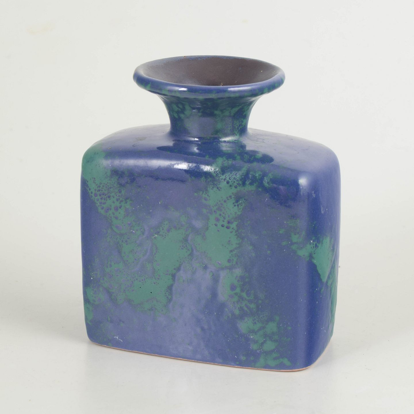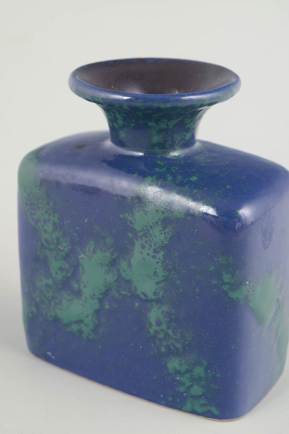 Kompakt og skulpturel vase udført i stentøj med kraftig, blank glasur i dybe blå og grønne nuancer. Formen er enkel og balanceret med let afrundede sider og smal hals.